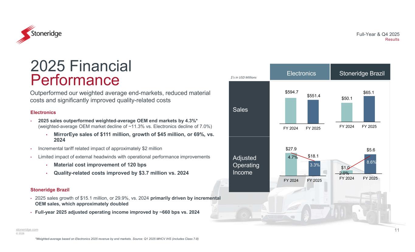11stoneridge.com © 2026 Full-Year & Q4 2025 Results 2025 Financial Performance Electronics • 2025 sales outperformed weighted-average OEM end markets by 4.3%* (weighted-average OEM market decline of ~11.3% vs. Electronics decline of 7.0%) • MirrorEye sales of $111 million, growth of $45 million, or 69%, vs. 2024 • Incremental tariff related impact of approximately $2 million • Limited impact of external headwinds with operational performance improvements • Material cost improvement of 120 bps • Quality-related costs improved by $3.7 million vs. 2024 Stoneridge Brazil • 2025 sales growth of $15.1 million, or 29.9%, vs. 2024 primarily driven by incremental OEM sales, which approximately doubled • Full-year 2025 adjusted operating income improved by ~660 bps vs. 2024 Outperformed our weighted average end-markets, reduced material costs and significantly improved quality-related costs Sales Adjusted Operating Income Electronics $’s in USD Millions *Weighted-average based on Electronics 2025 revenue by end markets. Source: Q1 2025 MHCV IHS (includes Class 7-8) $594.7 $551.4 FY 2024 FY 2025 $50.1 $65.1 FY 2024 FY 2025 $1.0 $5.6 2.0% 8.6% FY 2024 FY 2025 Stoneridge Brazil $27.9 $18.1 4.7% 3.3% FY 2024 FY 2025