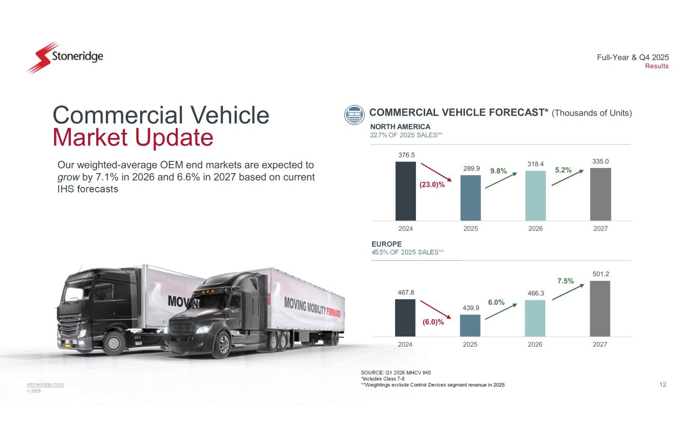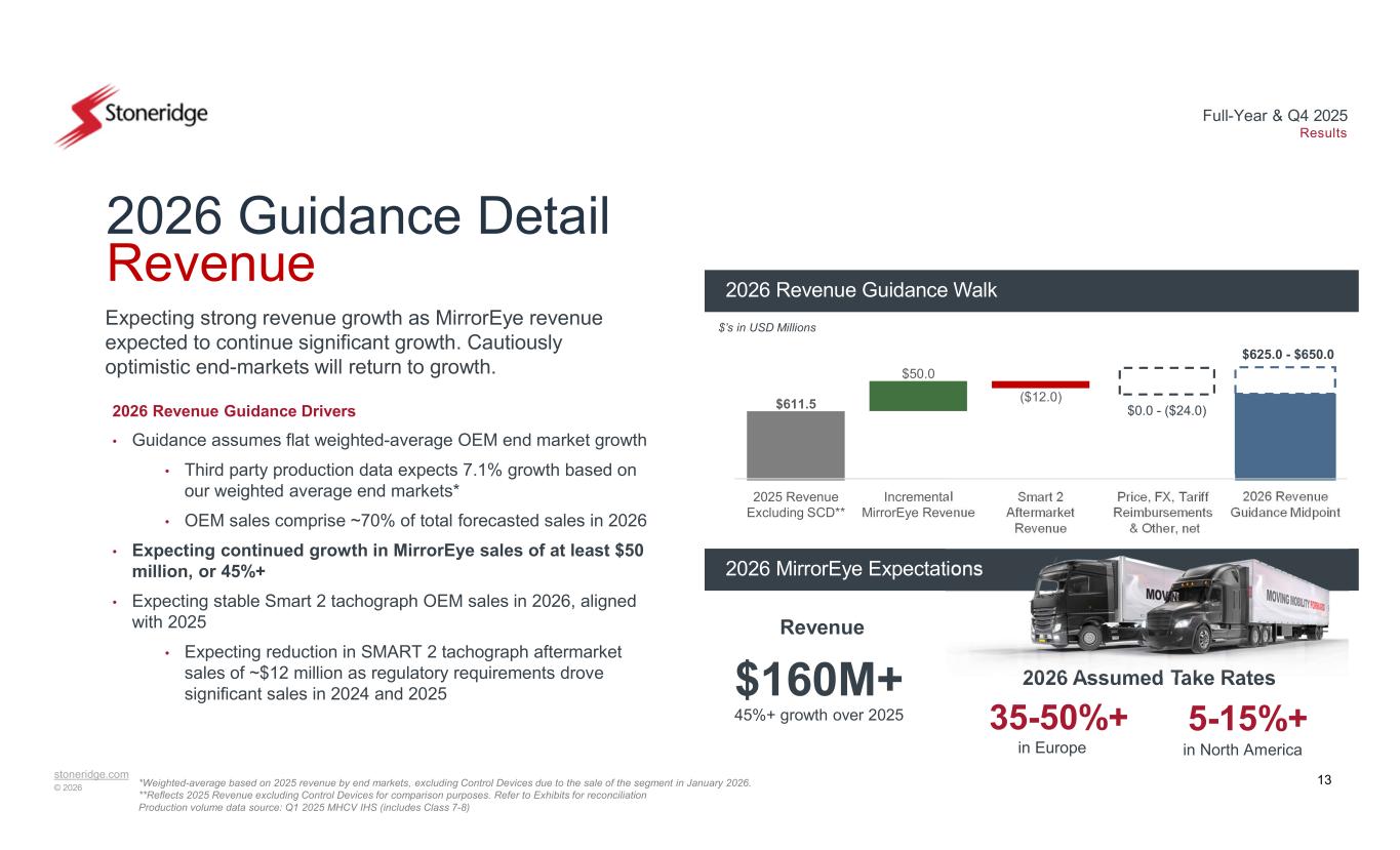 stoneridge.com © 2026 Full-Year & Q4 2025 Results 12 Commercial Vehicle Market Update NORTH AMERICA 22.7% OF 2025 SALES** EUROPE 45.5% OF 2025 SALES** COMMERCIAL VEHICLE FORECAST* (Thousands of Units) Our weighted-average OEM end markets are expected to grow by 7.1% in 2026 and 6.6% in 2027 based on current IHS forecasts SOURCE: Q1 2026 MHCV IHS *Includes Class 7-8 **Weightings exclude Control Devices segment revenue in 2025 376.5 289.9 318.4 335.0 2024 2025 2026 2027 467.8 439.9 466.3 501.2 2024 2025 2026 2027 (23.0)% 9.8% 5.2% (6.0)% 6.0% 7.5%