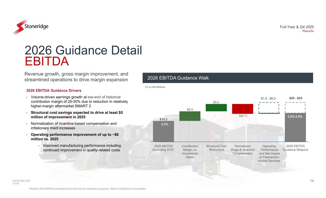 stoneridge.com © 2026 Full-Year & Q4 2025 Results $50.0 $611.5 ($12.0) 2025 Revenue Excluding SCD** Incremental MirrorEye Revenue Smart 2 Aftermarket Revenue Price, FX, Tariff Reimbursements & Other, net 2026 Revenue Guidance Midpoint 2026 Guidance Detail Revenue 2026 Revenue Guidance Drivers • Guidance assumes flat weighted-average OEM end market growth • Third party production data expects 7.1% growth based on our weighted average end markets* • OEM sales comprise ~70% of total forecasted sales in 2026 • Expecting continued growth in MirrorEye sales of at least $50 million, or 45%+ • Expecting stable Smart 2 tachograph OEM sales in 2026, aligned with 2025 • Expecting reduction in SMART 2 tachograph aftermarket sales of ~$12 million as regulatory requirements drove significant sales in 2024 and 2025 2026 Revenue Guidance Walk $625.0 - $650.0 Expecting strong revenue growth as MirrorEye revenue expected to continue significant growth. Cautiously optimistic end-markets will return to growth. $’s in USD Millions 45%+ growth over 2025 $160M+ in Europe 35-50%+ 2026 Assumed Take Rates Revenue in North America 5-15%+ *Weighted-average based on 2025 revenue by end markets, excluding Control Devices due to the sale of the segment in January 2026. **Reflects 2025 Revenue excluding Control Devices for comparison purposes. Refer to Exhibits for reconciliation Production volume data source: Q1 2025 MHCV IHS (includes Class 7-8) 2026 MirrorEye Expectations $0.0 - ($24.0) 13