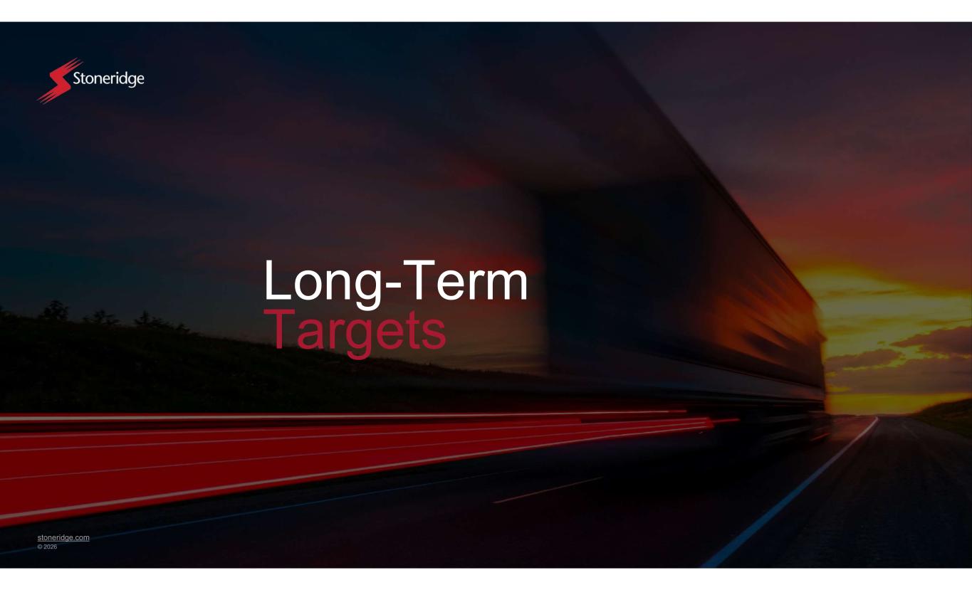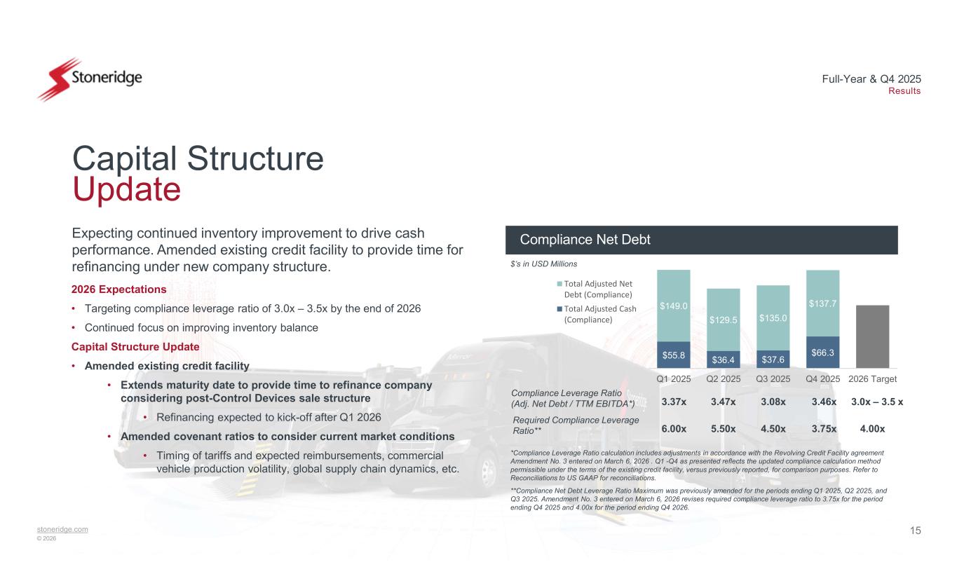 15stoneridge.com © 2026 Full-Year & Q4 2025 Results Capital Structure Update Expecting continued inventory improvement to drive cash performance. Amended existing credit facility to provide time for refinancing under new company structure. Compliance Leverage Ratio (Adj. Net Debt / TTM EBITDA*) $’s in USD Millions 2026 Expectations • Targeting compliance leverage ratio of 3.0x – 3.5x by the end of 2026 • Continued focus on improving inventory balance Capital Structure Update • Amended existing credit facility • Extends maturity date to provide time to refinance company considering post-Control Devices sale structure • Refinancing expected to kick-off after Q1 2026 • Amended covenant ratios to consider current market conditions • Timing of tariffs and expected reimbursements, commercial vehicle production volatility, global supply chain dynamics, etc. Compliance Net Debt *Compliance Leverage Ratio calculation includes adjustments in accordance with the Revolving Credit Facility agreement Amendment No. 3 entered on March 6, 2026 . Q1 -Q4 as presented reflects the updated compliance calculation method permissible under the terms of the existing credit facility, versus previously reported, for comparison purposes. Refer to Reconciliations to US GAAP for reconciliations. 3.08x 3.0x – 3.5 x3.47x3.37x **Compliance Net Debt Leverage Ratio Maximum was previously amended for the periods ending Q1 2025, Q2 2025, and Q3 2025. Amendment No. 3 entered on March 6, 2026 revises required compliance leverage ratio to 3.75x for the period ending Q4 2025 and 4.00x for the period ending Q4 2026. Required Compliance Leverage Ratio** 4.50x 4.00x5.50x6.00x $55.8 $36.4 $37.6 $66.3 $149.0 $129.5 $135.0 $137.7 Q1 2025 Q2 2025 Q3 2025 Q4 2025 2026 Target Total Adjusted Net Debt (Compliance) Total Adjusted Cash (Compliance) 3.46x 3.75x