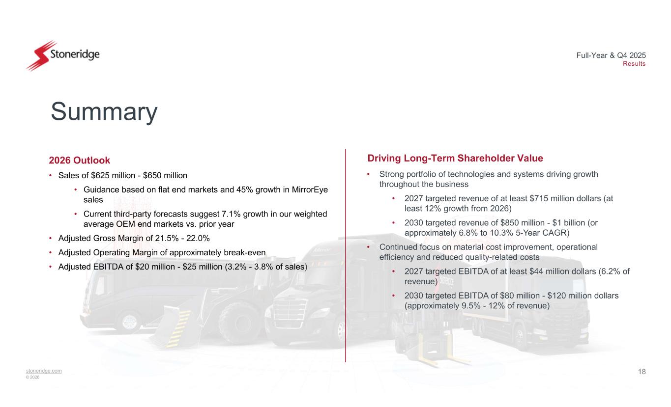17stoneridge.com © 2026 Full-Year & Q4 2025 Results $22.5 2026 Guidance Midpoint Incremental Sales Contribution 2027 Target 2030 Target $42 $35 2026 Guidance Midpoint OEM End Market Growth Incremental MirrorEye Revenue 2027 Target 2030 Target Long-Term EBITDA Targets Revenue Growth • Market outperformance driven by Stoneridge specific growth drivers • MirrorEye take-rate expansion as programs continue to mature and ramp-up • Strong growth expected for off-highway and bus camera systems • Growth in Brazil OEM programs • Connected trailer and 360-degree view opportunities build on MirrorEye platform • Supported by OEM backlog of $2.2 billion** EBITDA Expansion • Contribution margin on incremental revenue expected to be 25% - 30%, consistent with history • Focused on expanding gross margin through strong execution and ongoing material cost recovery strategies • Focused on leveraging existing cost structure to improve operating margin with growth Long-Term Targets *Weighted-average based on 2025 revenue by end market. Source: Feb 2025 LVP IHS; Q1 2025 MHCV IHS (includes Class 7-8) **5-year backlog as of December 31, 2025 based on Q4 2025 IHS MHCV; company data, customer provided data and management estimates ***5-year CAGR is based on 2025 actual revenue excluding the Control Devices (see reconciliation) and 2030 revenue targets Long-Term Revenue Targets Based on OEM weighted avg market growth of 6.6% $625 - $650 $715+ $850 - $1,000 6.8%-10.3% 5-year CAGR*** +720 – 970 bps vs. 2025 Aftermarket / Off-highway / Bus MirrorEye OEM 9.5% - 12.0% $20 - $25 $44+ $80 - $120+ 3.2% - 3.8% Contribution Margin based on historical range6.2% Brazilian OEM $’s in USD Millions Connected Trailer / 360-degree surround view $22