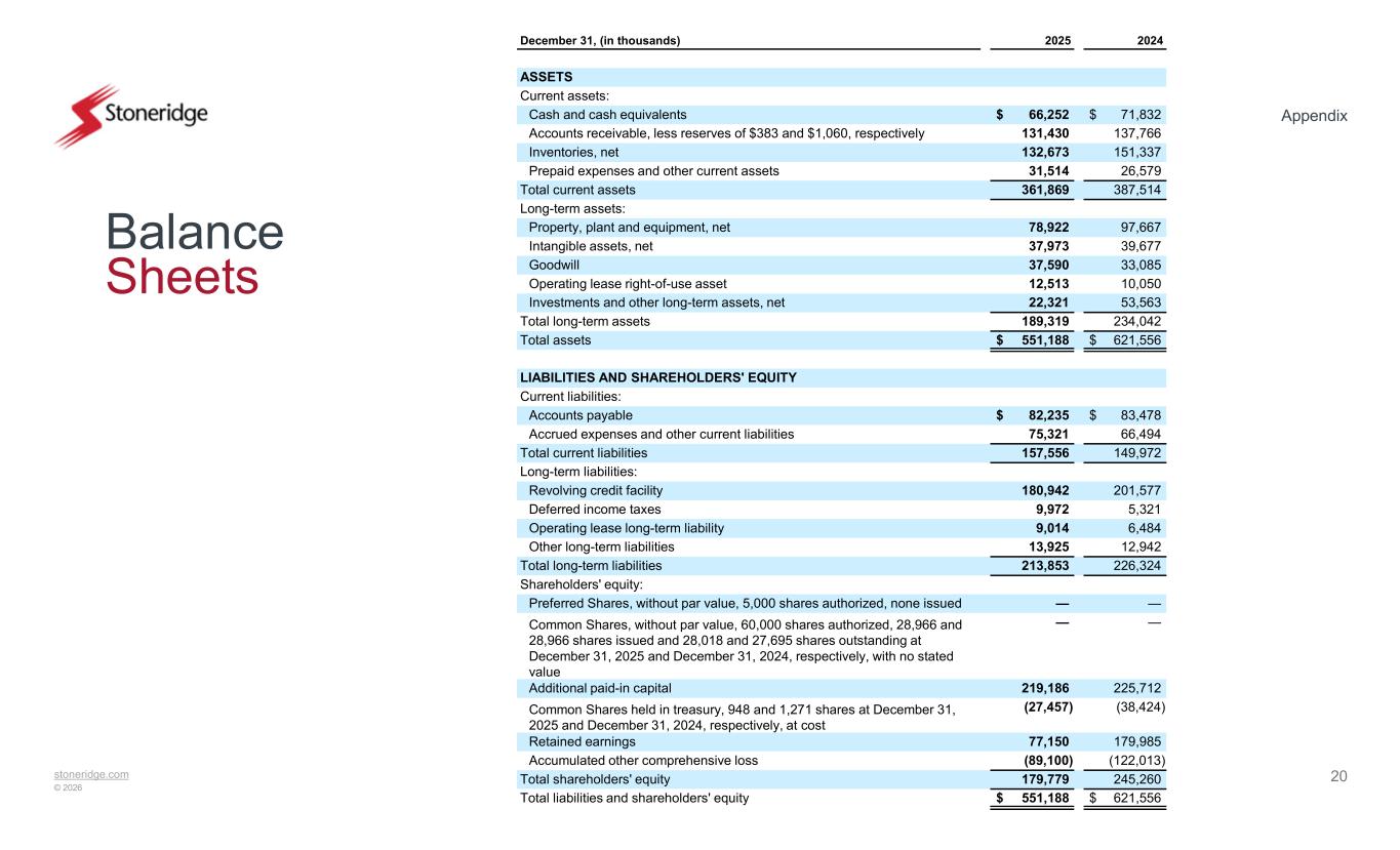 stoneridge.com © 2026 Appendix 20 Balance Sheets 20242025December 31, (in thousands) ASSETS Current assets: $ 71,832$ 66,252Cash and cash equivalents 137,766131,430Accounts receivable, less reserves of $383 and $1,060, respectively 151,337132,673Inventories, net 26,57931,514Prepaid expenses and other current assets 387,514361,869Total current assets Long-term assets: 97,66778,922Property, plant and equipment, net 39,67737,973Intangible assets, net 33,08537,590Goodwill 10,05012,513Operating lease right-of-use asset 53,56322,321Investments and other long-term assets, net 234,042189,319Total long-term assets $ 621,556$ 551,188Total assets LIABILITIES AND SHAREHOLDERS' EQUITY Current liabilities: $ 83,478$ 82,235Accounts payable 66,49475,321Accrued expenses and other current liabilities 149,972157,556Total current liabilities Long-term liabilities: 201,577180,942Revolving credit facility 5,3219,972Deferred income taxes 6,4849,014Operating lease long-term liability 12,94213,925Other long-term liabilities 226,324213,853Total long-term liabilities Shareholders' equity: ——Preferred Shares, without par value, 5,000 shares authorized, none issued ——Common Shares, without par value, 60,000 shares authorized, 28,966 and 28,966 shares issued and 28,018 and 27,695 shares outstanding at December 31, 2025 and December 31, 2024, respectively, with no stated value 225,712219,186Additional paid-in capital (38,424)(27,457)Common Shares held in treasury, 948 and 1,271 shares at December 31, 2025 and December 31, 2024, respectively, at cost 179,98577,150Retained earnings (122,013)(89,100)Accumulated other comprehensive loss 245,260179,779Total shareholders' equity $ 621,556$ 551,188Total liabilities and shareholders' equity