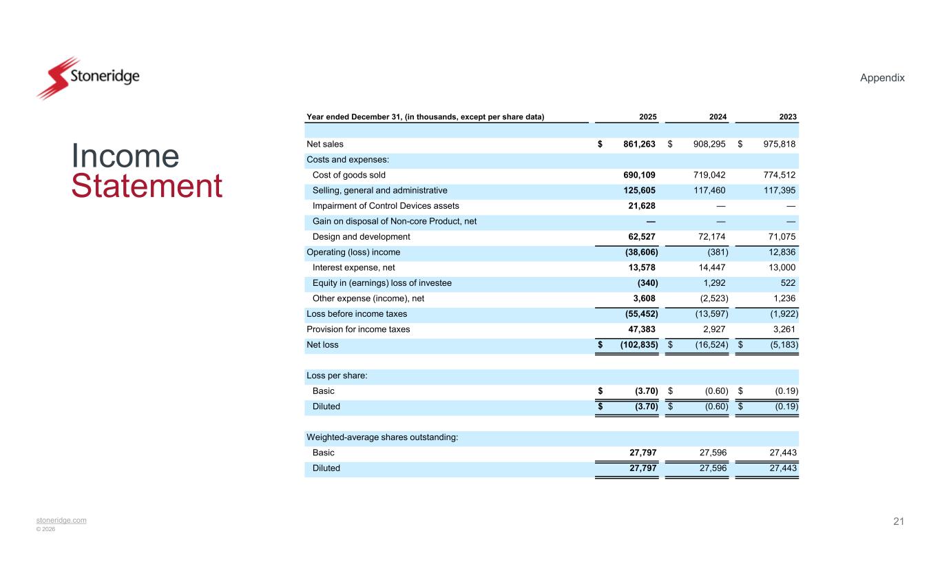 stoneridge.com © 2026 Appendix 21 Income Statement 202320242025Year ended December 31, (in thousands, except per share data) $ 975,818$ 908,295$ 861,263Net sales Costs and expenses: 774,512719,042690,109Cost of goods sold 117,395117,460125,605Selling, general and administrative ——21,628Impairment of Control Devices assets ———Gain on disposal of Non-core Product, net 71,07572,17462,527Design and development 12,836(381)(38,606)Operating (loss) income 13,00014,44713,578Interest expense, net 5221,292(340)Equity in (earnings) loss of investee 1,236(2,523)3,608Other expense (income), net (1,922)(13,597)(55,452)Loss before income taxes 3,2612,92747,383Provision for income taxes $ (5,183)$ (16,524)$ (102,835)Net loss Loss per share: $ (0.19)$ (0.60)$ (3.70)Basic $ (0.19)$ (0.60)$ (3.70)Diluted Weighted-average shares outstanding: 27,44327,59627,797Basic 27,44327,59627,797Diluted