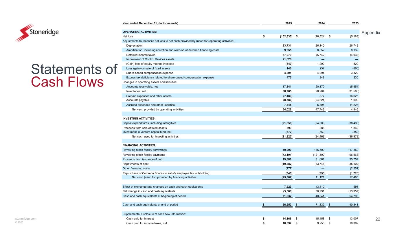 stoneridge.com © 2026 Appendix 22 Statements of Cash Flows 202320242025Year ended December 31, (in thousands) OPERATING ACTIVITIES: $ (5,183)$ (16,524)$ (102,835)Net loss Adjustments to reconcile net loss to net cash provided by (used for) operating activities: 26,74926,14023,731Depreciation 8,1328,8529,955Amortization, including accretion and write-off of deferred financing costs (4,038)(5,742)37,079Deferred income taxes ——21,628Impairment of Control Devices assets 5221,292(340)(Gain) loss of equity method investee (860)257146Loss (gain) on sale of fixed assets 3,3224,0944,801Share-based compensation expense 230248475Excess tax deficiency related to share-based compensation expense Changes in operating assets and liabilities: (5,854)20,17017,341Accounts receivable, net (31,563)26,90430,765Inventories, net 16,625877(7,489)Prepaid expenses and other assets 1,090(24,624)(8,780)Accounts payable (4,226)5,8047,545Accrued expenses and other liabilities 4,94647,74834,022Net cash provided by operating activities INVESTING ACTIVITIES: (38,498)(24,303)(21,850)Capital expenditures, including intangibles 1,869385399Proceeds from sale of fixed assets (350)(550)(372)Investment in venture capital fund, net (36,979)(24,468)(21,823)Net cash used for investing activities FINANCING ACTIVITIES: 117,369135,50049,000Revolving credit facility borrowings (96,568)(121,500)(73,191)Revolving credit facility payments 35,75731,66119,888Proceeds from issuance of debt (35,102)(33,745)(19,882)Repayments of debt (2,251)—(777)Other financing costs (1,720)(795)(340)Repurchase of Common Shares to satisfy employee tax withholding 17,48511,121(25,302)Net cash (used for) provided by financing activities 591(3,410)7,523Effect of exchange rate changes on cash and cash equivalents (13,957)30,991(5,580)Net change in cash and cash equivalents 54,79840,84171,832Cash and cash equivalents at beginning of period $ 40,841$ 71,832$ 66,252Cash and cash equivalents at end of period Supplemental disclosure of cash flow information: $ 13,007$ 15,458$ 14,166Cash paid for interest $ 10,302$ 9,255$ 10,337Cash paid for income taxes, net