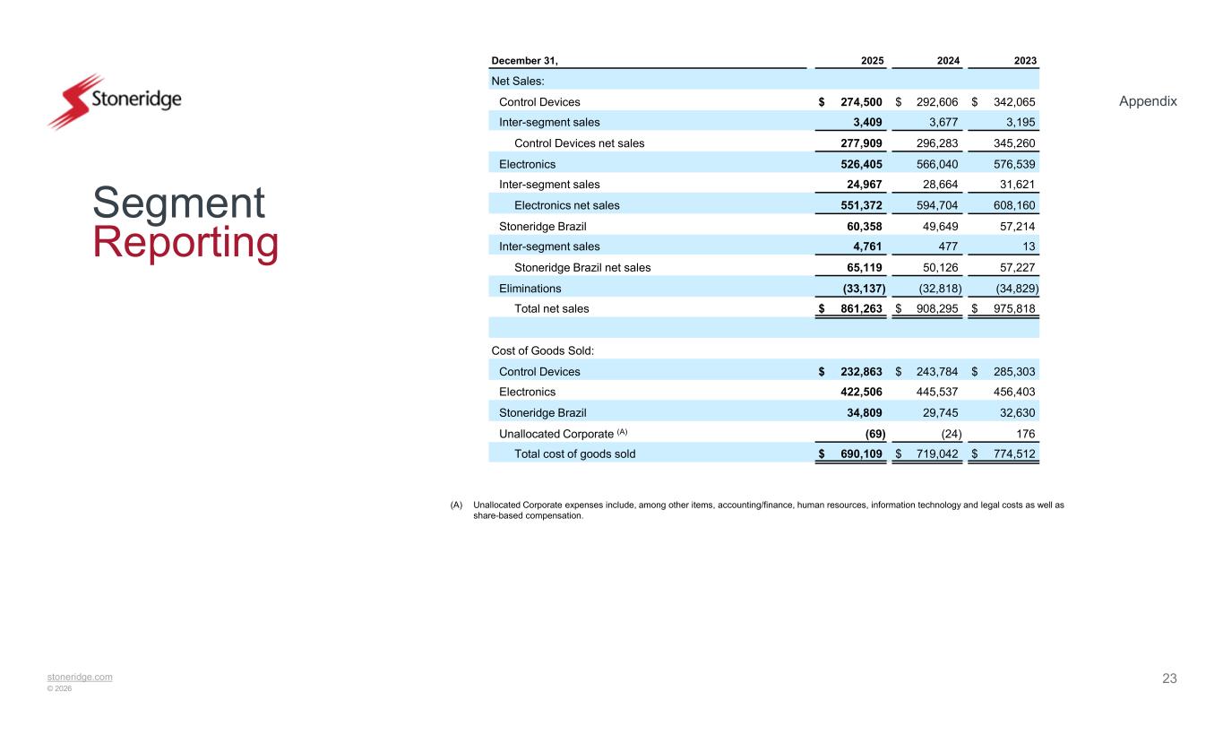 stoneridge.com © 2026 Appendix 23 Segment Reporting (A) Unallocated Corporate expenses include, among other items, accounting/finance, human resources, information technology and legal costs as well as share-based compensation. 202320242025December 31, Net Sales: $ 342,065$ 292,606$ 274,500Control Devices 3,1953,6773,409Inter-segment sales 345,260296,283277,909Control Devices net sales 576,539566,040526,405Electronics 31,62128,66424,967Inter-segment sales 608,160594,704551,372Electronics net sales 57,21449,64960,358Stoneridge Brazil 134774,761Inter-segment sales 57,22750,12665,119Stoneridge Brazil net sales (34,829)(32,818)(33,137)Eliminations $ 975,818$ 908,295$ 861,263Total net sales Cost of Goods Sold: $ 285,303$ 243,784$ 232,863Control Devices 456,403445,537422,506Electronics 32,63029,74534,809Stoneridge Brazil 176(24)(69)Unallocated Corporate (A) $ 774,512$ 719,042$ 690,109Total cost of goods sold