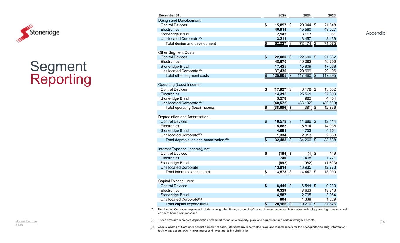 stoneridge.com © 2026 Appendix 24 Segment Reporting (A) Unallocated Corporate expenses include, among other items, accounting/finance, human resources, information technology and legal costs as well as share-based compensation. (B) These amounts represent depreciation and amortization on a property, plant and equipment and certain intangible assets. (C) Assets located at Corporate consist primarily of cash, intercompany receivables, fixed and leased assets for the headquarter building, information technology assets, equity investments and investments in subsidiaries Design and Development: $ 21,848$ 20,044$ 15,857Control Devices 43,02745,56040,914Electronics 3,0613,1132,545Stoneridge Brazil 3,1393,4573,211Unallocated Corporate (A) $ 71,075$ 72,174$ 62,527Total design and development Other Segment Costs: $ 21,332$ 22,600$ 22,080Control Devices 49,79949,38248,670Electronics 17,06815,80917,425Stoneridge Brazil 29,19629,66937,430Unallocated Corporate (A) $ 117,395$ 117,460$ 125,605Total other segment costs Operating (Loss) Income: $ 13,582$ 6,178$ (17,927)Control Devices 27,30925,56114,315Electronics 4,4549825,578Stoneridge Brazil (32,509)(33,102)(40,572)Unallocated Corporate (A) $ 12,836$ (381)$ (38,606)Total operating (loss) income Depreciation and Amortization: $ 12,414$ 11,686$ 10,578Control Devices 14,03515,81415,885Electronics 4,8014,7534,691Stoneridge Brazil 2,3882,0131,334Unallocated Corporate(C) $ 33,638$ 34,266$ 32,488Total depreciation and amortization (B) Interest Expense (Income), net: $ 149$ (4)$ (184)Control Devices 1,7711,498740Electronics (1,693)(982)(892)Stoneridge Brazil 12,77313,93513,914Unallocated Corporate $ 13,000$ 14,447$ 13,578Total interest expense, net Capital Expenditures: $ 9,230$ 6,544$ 8,446Control Devices 18,3138,6236,329Electronics 3,0542,7054,587Stoneridge Brazil 1,2291,338804Unallocated Corporate(C) $ 31,826$ 19,210$ 20,166Total capital expenditures