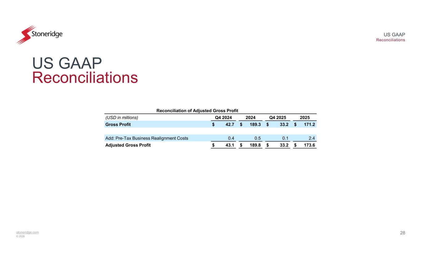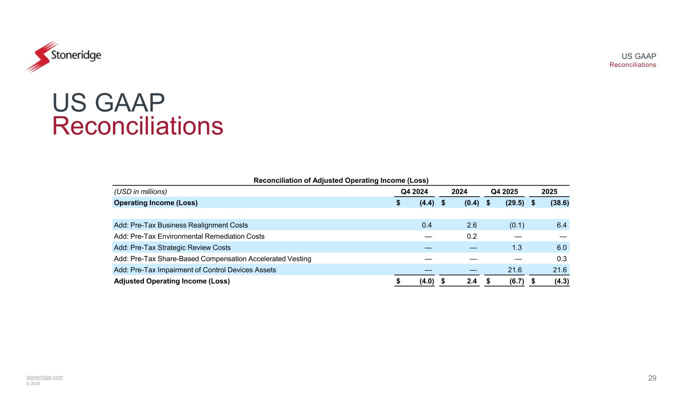 stoneridge.com © 2026 US GAAP Reconciliations 28 US GAAP Reconciliations Reconciliation of Adjusted Gross Profit 2025Q4 20252024Q4 2024(USD in millions) $ 171.2$ 33.2$ 189.3$ 42.7Gross Profit 2.40.10.50.4Add: Pre-Tax Business Realignment Costs $ 173.6$ 33.2$ 189.8$ 43.1Adjusted Gross Profit