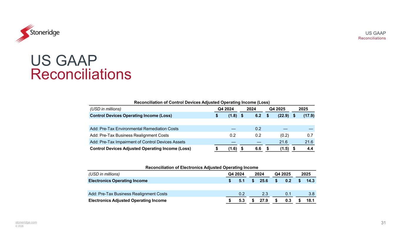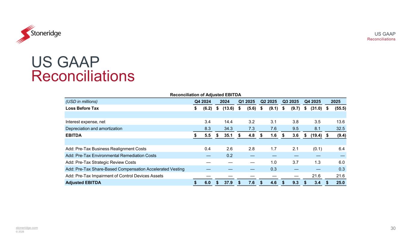 stoneridge.com © 2026 US GAAP Reconciliations 30 US GAAP Reconciliations Reconciliation of Adjusted EBITDA 2025Q4 2025Q3 2025Q2 2025Q1 20252024Q4 2024(USD in millions) $ (55.5)$ (31.0)$ (9.7)$ (9.1)$ (5.6)$ (13.6)$ (6.2)Loss Before Tax 13.63.53.83.13.214.43.4Interest expense, net 32.58.19.57.67.334.38.3Depreciation and amortization $ (9.4)$ (19.4)$ 3.6$ 1.6$ 4.8$ 35.1$ 5.5EBITDA 6.4(0.1)2.11.72.82.60.4Add: Pre-Tax Business Realignment Costs —————0.2—Add: Pre-Tax Environmental Remediation Costs 6.01.33.71.0———Add: Pre-Tax Strategic Review Costs 0.3——0.3———Add: Pre-Tax Share-Based Compensation Accelerated Vesting 21.621.6—————Add: Pre-Tax Impairment of Control Devices Assets $ 25.0$ 3.4$ 9.3$ 4.6$ 7.6$ 37.9$ 6.0Adjusted EBITDA