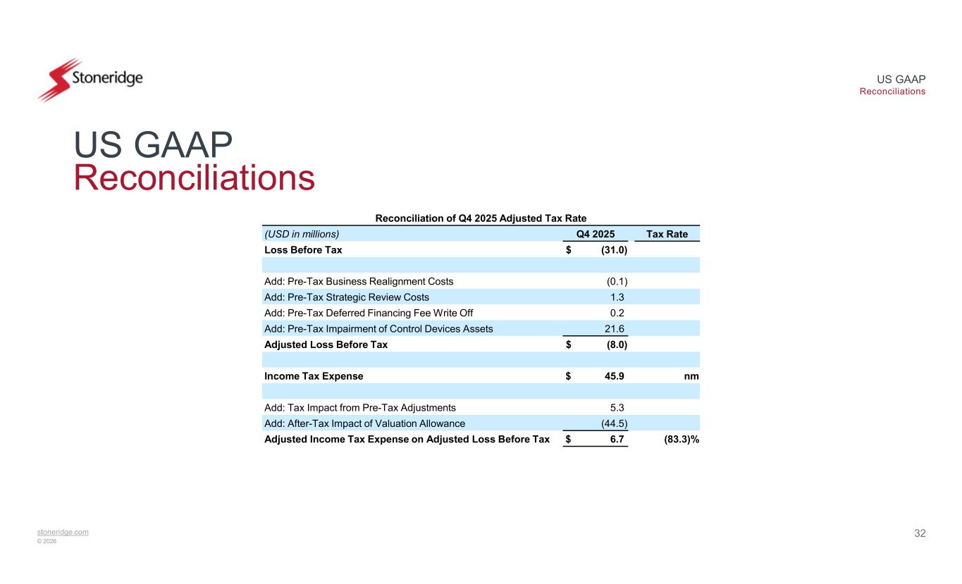 stoneridge.com © 2026 US GAAP Reconciliations 31 US GAAP Reconciliations Reconciliation of Electronics Adjusted Operating Income 2025Q4 20252024Q4 2024(USD in millions) $ 14.3$ 0.2$ 25.6$ 5.1Electronics Operating Income 3.80.12.30.2Add: Pre-Tax Business Realignment Costs $ 18.1$ 0.3$ 27.9$ 5.3Electronics Adjusted Operating Income Reconciliation of Control Devices Adjusted Operating Income (Loss) 2025Q4 20252024Q4 2024(USD in millions) $ (17.9)$ (22.9)$ 6.2$ (1.8)Control Devices Operating Income (Loss) ——0.2—Add: Pre-Tax Environmental Remediation Costs 0.7(0.2)0.20.2Add: Pre-Tax Business Realignment Costs 21.621.6——Add: Pre-Tax Impairment of Control Devices Assets $ 4.4$ (1.5)$ 6.6$ (1.6)Control Devices Adjusted Operating Income (Loss)