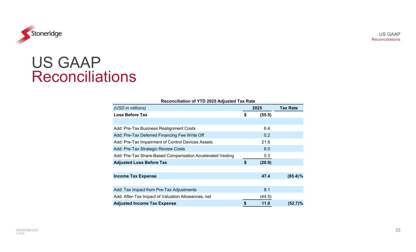 stoneridge.com © 2026 US GAAP Reconciliations 32 US GAAP Reconciliations Reconciliation of Q4 2025 Adjusted Tax Rate Tax RateQ4 2025(USD in millions) $ (31.0)Loss Before Tax (0.1)Add: Pre-Tax Business Realignment Costs 1.3Add: Pre-Tax Strategic Review Costs 0.2Add: Pre-Tax Deferred Financing Fee Write Off 21.6Add: Pre-Tax Impairment of Control Devices Assets $ (8.0)Adjusted Loss Before Tax nm$ 45.9Income Tax Expense 5.3Add: Tax Impact from Pre-Tax Adjustments (44.5)Add: After-Tax Impact of Valuation Allowance (83.3)%$ 6.7Adjusted Income Tax Expense on Adjusted Loss Before Tax