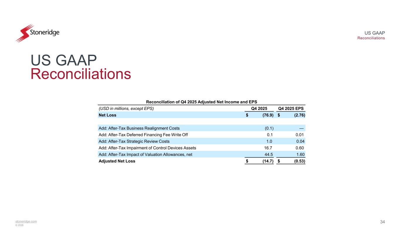 stoneridge.com © 2026 US GAAP Reconciliations 33 US GAAP Reconciliations Reconciliation of YTD 2025 Adjusted Tax Rate Tax Rate2025(USD in millions) $ (55.5)Loss Before Tax 6.4Add: Pre-Tax Business Realignment Costs 0.2Add: Pre-Tax Deferred Financing Fee Write Off 21.6Add: Pre-Tax Impairment of Control Devices Assets 6.0Add: Pre-Tax Strategic Review Costs 0.3Add: Pre-Tax Share-Based Compensation Accelerated Vesting $ (20.9)Adjusted Loss Before Tax (85.4)%47.4Income Tax Expense 8.1Add: Tax Impact from Pre-Tax Adjustments (44.5)Add: After-Tax Impact of Valuation Allowances, net (52.7)%$ 11.0Adjusted Income Tax Expense