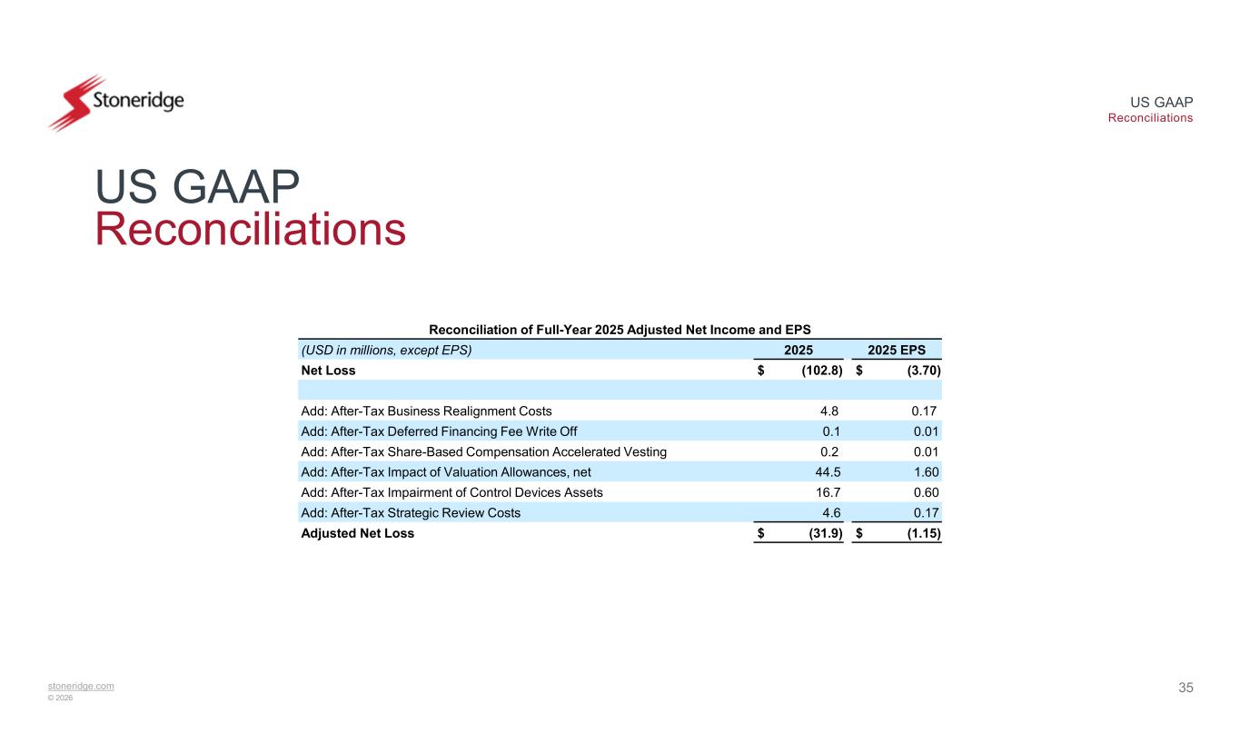 stoneridge.com © 2026 US GAAP Reconciliations 34 US GAAP Reconciliations Reconciliation of Q4 2025 Adjusted Net Income and EPS Q4 2025 EPSQ4 2025(USD in millions, except EPS) $ (2.76)$ (76.9)Net Loss —(0.1)Add: After-Tax Business Realignment Costs 0.010.1Add: After-Tax Deferred Financing Fee Write Off 0.041.0Add: After-Tax Strategic Review Costs 0.6016.7Add: After-Tax Impairment of Control Devices Assets 1.6044.5Add: After-Tax Impact of Valuation Allowances, net $ (0.53)$ (14.7)Adjusted Net Loss