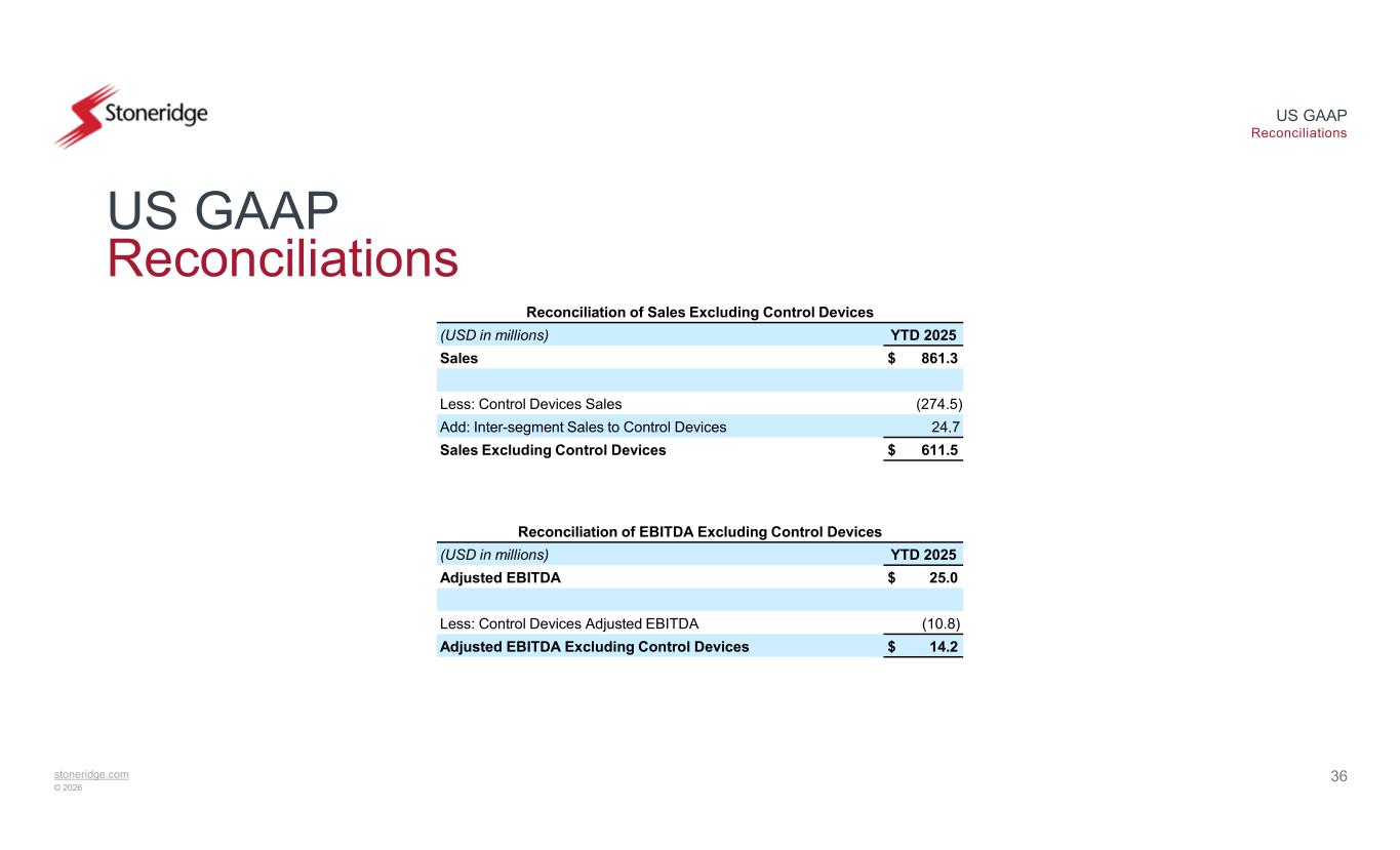stoneridge.com © 2026 US GAAP Reconciliations 35 US GAAP Reconciliations Reconciliation of Full-Year 2025 Adjusted Net Income and EPS 2025 EPS2025(USD in millions, except EPS) $ (3.70)$ (102.8)Net Loss 0.174.8Add: After-Tax Business Realignment Costs 0.010.1Add: After-Tax Deferred Financing Fee Write Off 0.010.2Add: After-Tax Share-Based Compensation Accelerated Vesting 1.6044.5Add: After-Tax Impact of Valuation Allowances, net 0.6016.7Add: After-Tax Impairment of Control Devices Assets 0.174.6Add: After-Tax Strategic Review Costs $ (1.15)$ (31.9)Adjusted Net Loss