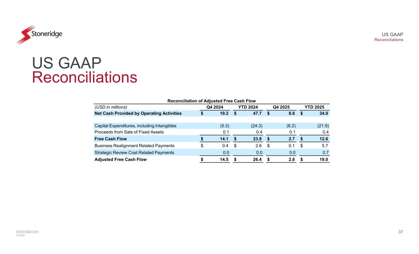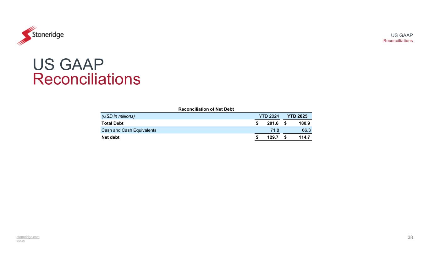stoneridge.com © 2026 US GAAP Reconciliations 37 US GAAP Reconciliations Reconciliation of Adjusted Free Cash Flow YTD 2025Q4 2025YTD 2024Q4 2024(USD in millions) $ 34.0$ 8.8$ 47.7$ 19.2Net Cash Provided by Operating Activities (21.9)(6.2)(24.3)(5.3)Capital Expenditures, including Intangibles 0.40.10.40.1Proceeds from Sale of Fixed Assets $ 12.6$ 2.7$ 23.8$ 14.1Free Cash Flow $ 5.7$ 0.1$ 2.6$ 0.4Business Realignment Related Payments 0.70.00.00.0Strategic Review Cost Related Payments $ 19.0$ 2.8$ 26.4$ 14.5Adjusted Free Cash Flow
