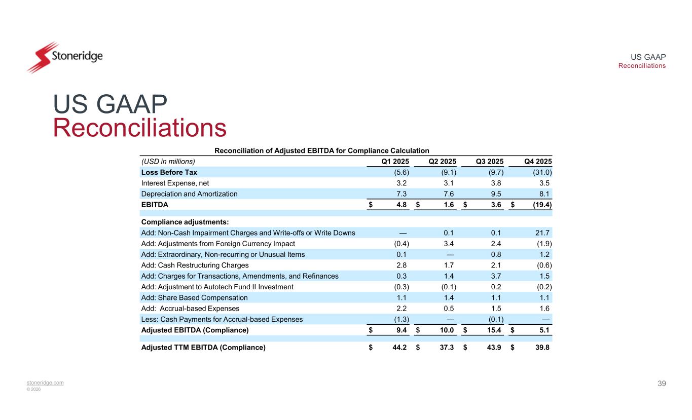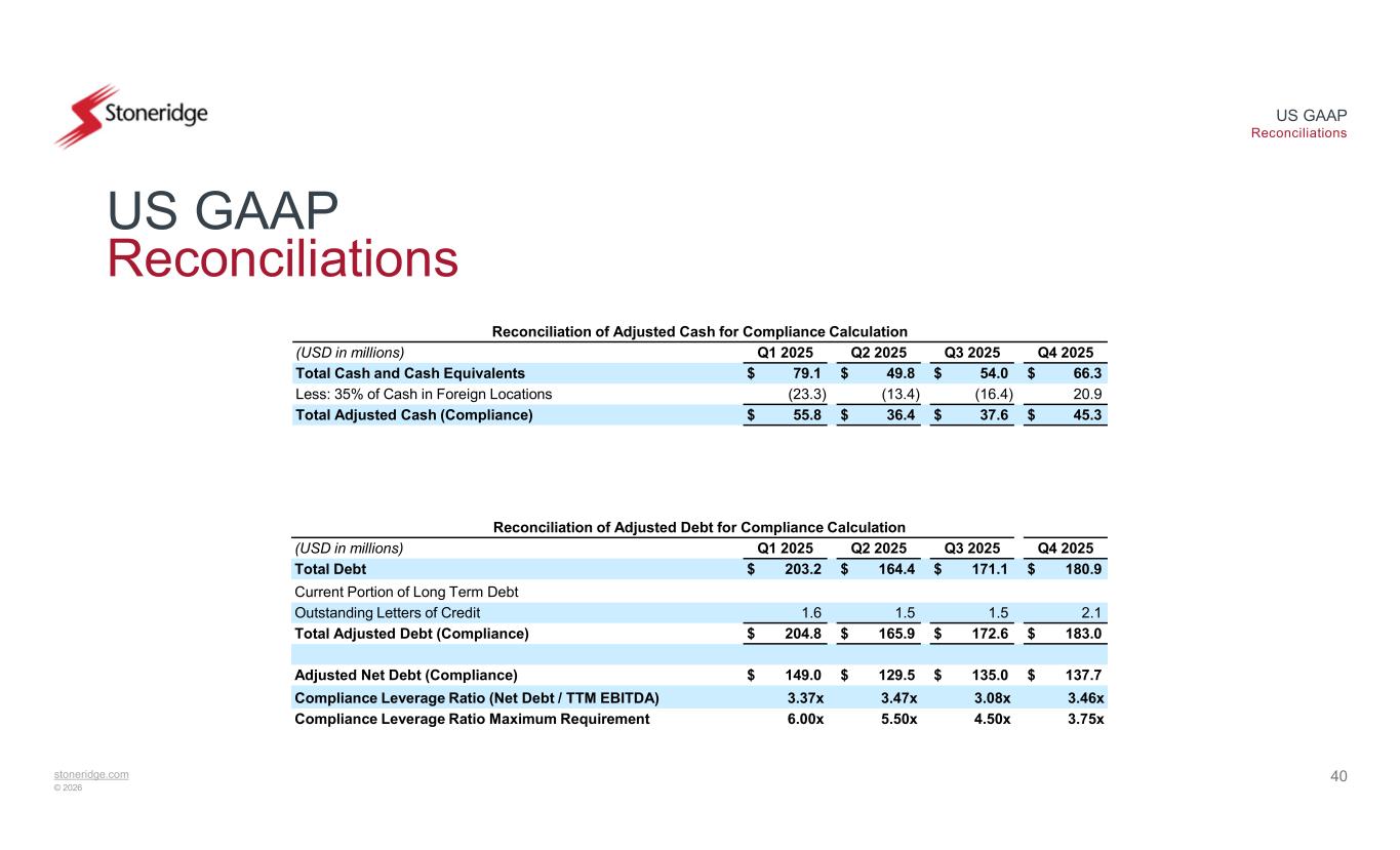 stoneridge.com © 2026 US GAAP Reconciliations 39 US GAAP Reconciliations Reconciliation of Adjusted EBITDA for Compliance Calculation Q4 2025Q3 2025Q2 2025Q1 2025(USD in millions) (31.0)(9.7)(9.1)(5.6)Loss Before Tax 3.53.83.13.2Interest Expense, net 8.19.57.67.3Depreciation and Amortization $ (19.4)$ 3.6$ 1.6$ 4.8EBITDA Compliance adjustments: 21.70.10.1—Add: Non-Cash Impairment Charges and Write-offs or Write Downs (1.9)2.43.4(0.4)Add: Adjustments from Foreign Currency Impact 1.20.8—0.1Add: Extraordinary, Non-recurring or Unusual Items (0.6)2.11.72.8Add: Cash Restructuring Charges 1.53.71.40.3Add: Charges for Transactions, Amendments, and Refinances (0.2)0.2(0.1)(0.3)Add: Adjustment to Autotech Fund II Investment 1.11.11.41.1Add: Share Based Compensation 1.61.50.52.2Add: Accrual-based Expenses —(0.1)—(1.3)Less: Cash Payments for Accrual-based Expenses $ 5.1$ 15.4$ 10.0$ 9.4Adjusted EBITDA (Compliance) $ 39.8$ 43.9$ 37.3$ 44.2Adjusted TTM EBITDA (Compliance)