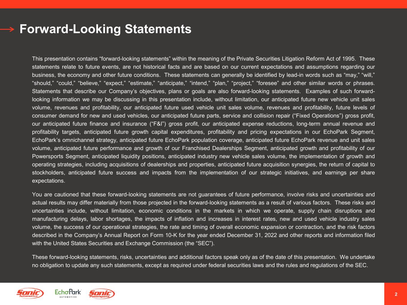 2 Forward-Looking Statements This presentation contains “forward-looking statements” within the meaning of the Private Securities Litigation Reform Act of 1995. These statements relate to future events, are not historical facts and are based on our current expectations and assumptions regarding our business, the economy and other future conditions. These statements can generally be identified by lead-in words such as “may,” “will,” “should,” “could,” “believe,” “expect,” “estimate,” “anticipate,” “intend,” “plan,” “project,” “foresee” and other similar words or phrases. Statements that describe our Company’s objectives, plans or goals are also forward-looking statements. Examples of such forward- looking information we may be discussing in this presentation include, without limitation, our anticipated future new vehicle unit sales volume, revenues and profitability, our anticipated future used vehicle unit sales volume, revenues and profitability, future levels of consumer demand for new and used vehicles, our anticipated future parts, service and collision repair (“Fixed Operations”) gross profit, our anticipated future finance and insurance (“F&I”) gross profit, our anticipated expense reductions, long-term annual revenue and profitability targets, anticipated future growth capital expenditures, profitability and pricing expectations in our EchoPark Segment, EchoPark’s omnichannel strategy, anticipated future EchoPark population coverage, anticipated future EchoPark revenue and unit sales volume, anticipated future performance and growth of our Franchised Dealerships Segment, anticipated growth and profitability of our Powersports Segment, anticipated liquidity positions, anticipated industry new vehicle sales volume, the implementation of growth and operating strategies, including acquisitions of dealerships and properties, anticipated future acquisition synergies, the return of capital to stockholders, anticipated future success and impacts from the implementation of our strategic initiatives, and earnings per share expectations. You are cautioned that these forward-looking statements are not guarantees of future performance, involve risks and uncertainties and actual results may differ materially from those projected in the forward-looking statements as a result of various factors. These risks and uncertainties include, without limitation, economic conditions in the markets in which we operate, supply chain disruptions and manufacturing delays, labor shortages, the impacts of inflation and increases in interest rates, new and used vehicle industry sales volume, the success of our operational strategies, the rate and timing of overall economic expansion or contraction, and the risk factors described in the Company’s Annual Report on Form 10-K for the year ended December 31, 2022 and other reports and information filed with the United States Securities and Exchange Commission (the “SEC”). These forward-looking statements, risks, uncertainties and additional factors speak only as of the date of this presentation. We undertake no obligation to update any such statements, except as required under federal securities laws and the rules and regulations of the SEC.