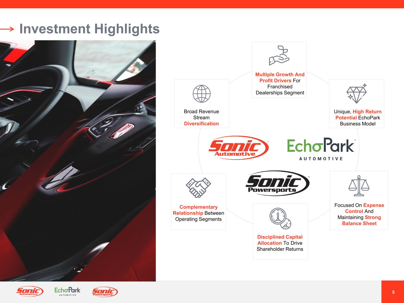 4 ® Sonic Automotive: Who We Are QUICK FACTS (NYSE: SAH) a Fortune 500 Company and One of the Nation’s Largest Automotive Retailers 139 35+ 20 16 $14.4 Billion $2.2 Billion 112K New Vehicles Sold 176K Total Revenues Brands Locations Used Vehicles Sold Collision Centers States Gross Profit Note: Location Counts As Of February 14, 2024 Revenues, Gross Profit, New & Used Vehicles Sold are for FY 2023 Our Core Franchised Dealerships Segment Is A Full-Service Automotive Retail Business With Strategic Growth Levers Across Multiple Business Lines And A Diversified Brand Portfolio Our High Growth Potential EchoPark Segment Offers A Unique Approach To Pre-Owned Vehicle And F&I Sales Below-Market Pricing With A No Haggle Purchase Experience Drives Industry-Leading Used Vehicle Volume Throughput Early-Stage Consolidation Growth Opportunity At Attractive Multiples