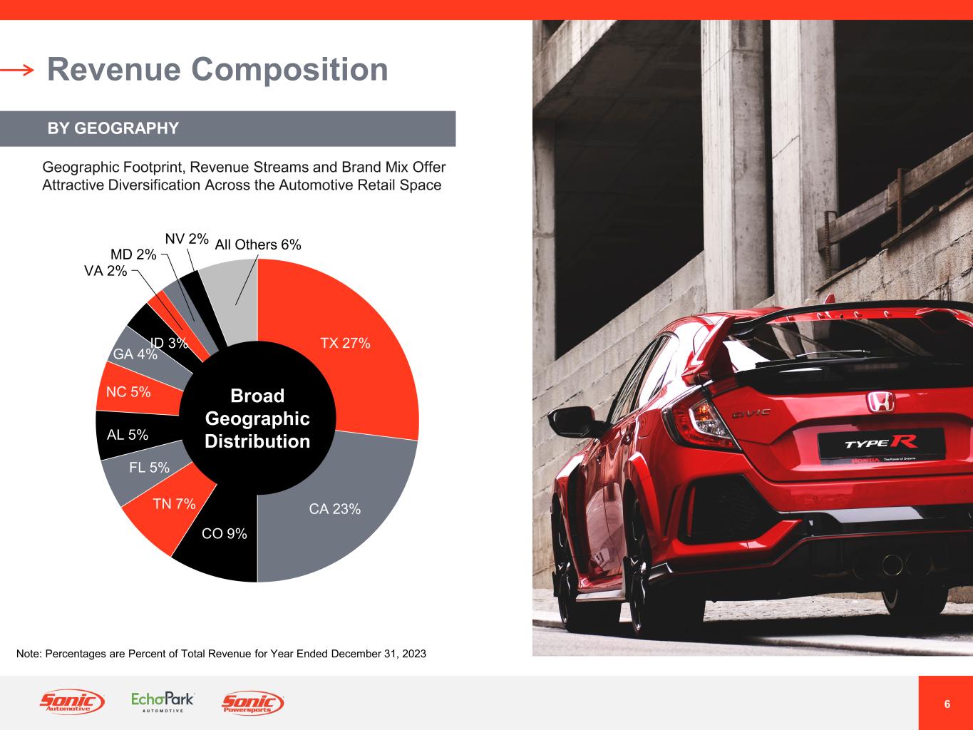 5 Investment Highlights Multiple Growth And Profit Drivers For Franchised Dealerships Segment Unique, High Return Potential EchoPark Business Model Broad Revenue Stream Diversification Complementary Relationship Between Operating Segments Disciplined Capital Allocation To Drive Shareholder Returns Focused On Expense Control And Maintaining Strong Balance Sheet