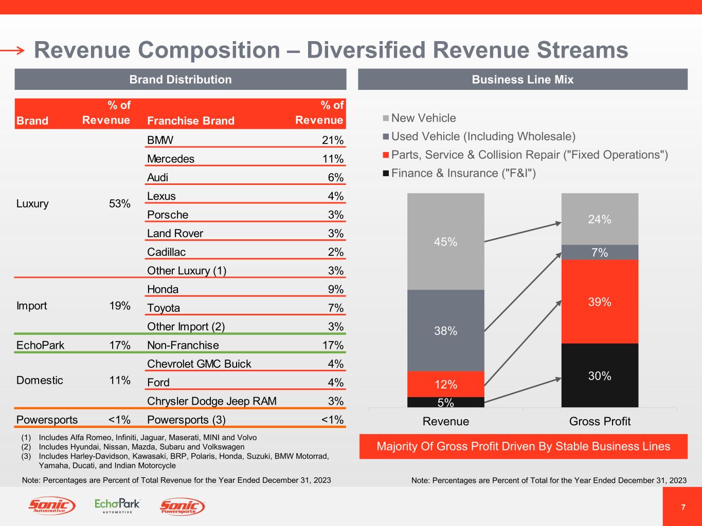 6 Revenue Composition BY GEOGRAPHY TX 27% CA 23% CO 9% TN 7% FL 5% AL 5% NC 5% GA 4% ID 3% VA 2% MD 2% NV 2% All Others 6% Broad Geographic Distribution Geographic Footprint, Revenue Streams and Brand Mix Offer Attractive Diversification Across the Automotive Retail Space Note: Percentages are Percent of Total Revenue for Year Ended December 31, 2023