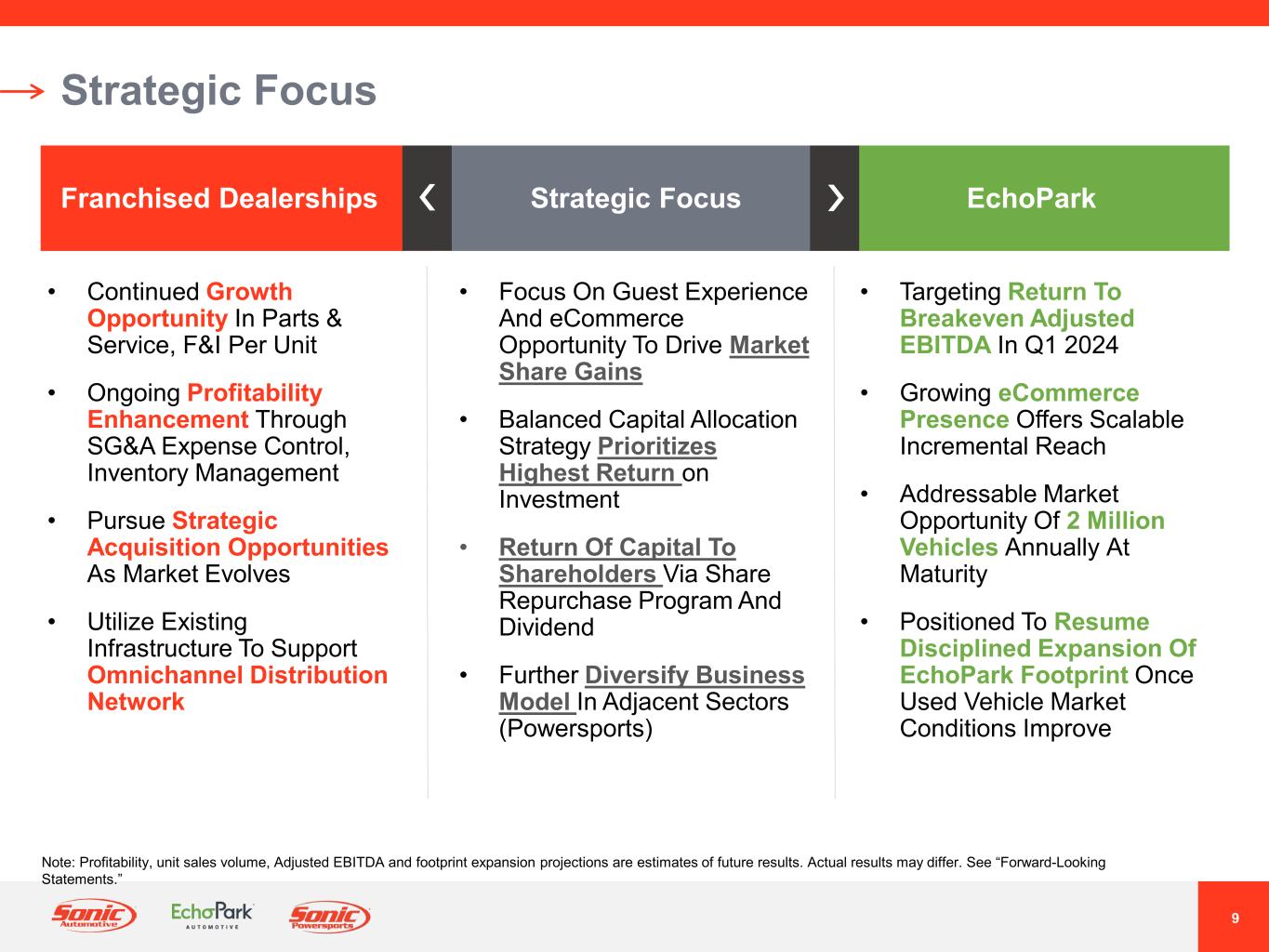 8 ® EchoPark Automotive – A Unique Growth Story Planned Nationwide Distribution Network At Maturity Unique, High Return Potential Business Model Focus On High Quality Pre-Owned Vehicles, In-Store or Online Plan To Reach 90% Of U.S. Population At Maturity Priced Up To $3,000 Below Market With Simplified, Easy Purchase Experience Focus On Pre-Owned Market – 2.5x Larger & More Stable Than New Vehicle Market The New Car Alternative Price. Quality. Experience. Note: Expected U.S. population reach is a projection, actual results may differ. See “Forward-Looking Statements.”