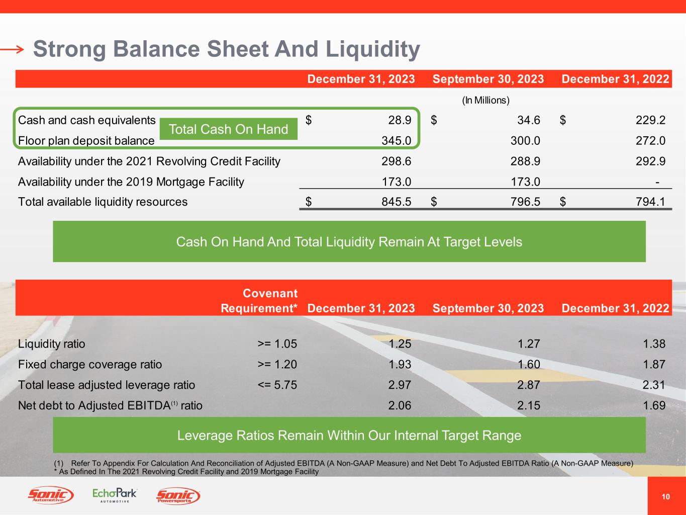 9 Strategic Focus • Continued Growth Opportunity In Parts & Service, F&I Per Unit • Ongoing Profitability Enhancement Through SG&A Expense Control, Inventory Management • Pursue Strategic Acquisition Opportunities As Market Evolves • Utilize Existing Infrastructure To Support Omnichannel Distribution Network • Targeting Return To Breakeven Adjusted EBITDA In Q1 2024 • Growing eCommerce Presence Offers Scalable Incremental Reach • Addressable Market Opportunity Of 2 Million Vehicles Annually At Maturity • Positioned To Resume Disciplined Expansion Of EchoPark Footprint Once Used Vehicle Market Conditions Improve • Focus On Guest Experience And eCommerce Opportunity To Drive Market Share Gains • Balanced Capital Allocation Strategy Prioritizes Highest Return on Investment • Return Of Capital To Shareholders Via Share Repurchase Program And Dividend • Further Diversify Business Model In Adjacent Sectors (Powersports) Franchised Dealerships EchoParkStrategic Focus Note: Profitability, unit sales volume, Adjusted EBITDA and footprint expansion projections are estimates of future results. Actual results may differ. See “Forward-Looking Statements.”