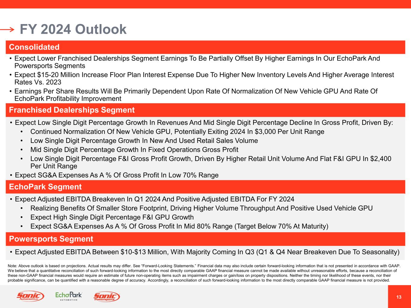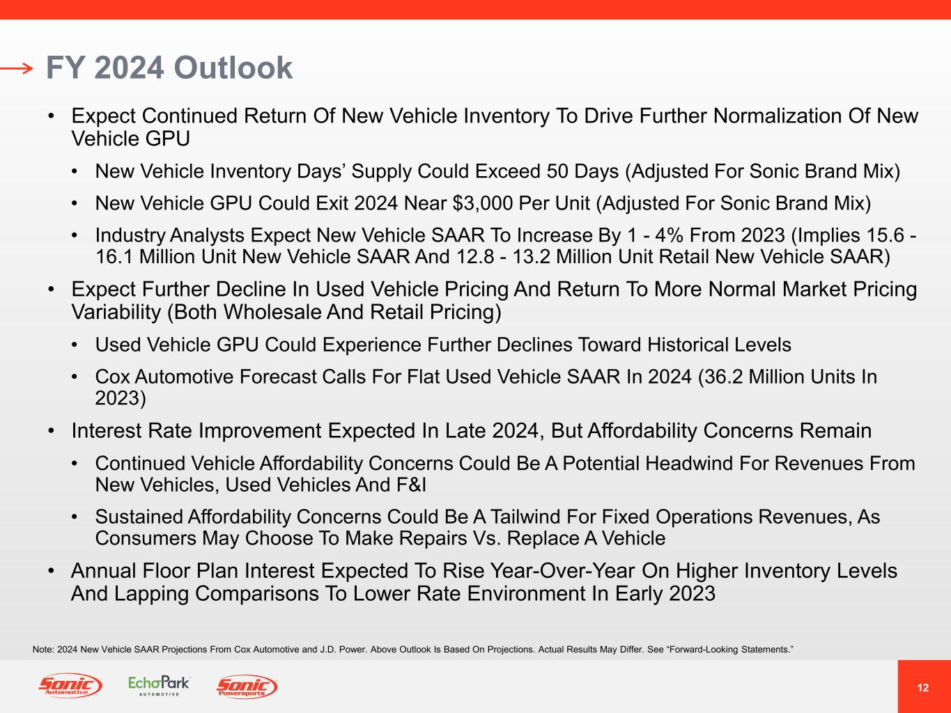 12 FY 2024 Outlook • Expect Continued Return Of New Vehicle Inventory To Drive Further Normalization Of New Vehicle GPU • New Vehicle Inventory Days’ Supply Could Exceed 50 Days (Adjusted For Sonic Brand Mix) • New Vehicle GPU Could Exit 2024 Near $3,000 Per Unit (Adjusted For Sonic Brand Mix) • Industry Analysts Expect New Vehicle SAAR To Increase By 1 - 4% From 2023 (Implies 15.6 - 16.1 Million Unit New Vehicle SAAR And 12.8 - 13.2 Million Unit Retail New Vehicle SAAR) • Expect Further Decline In Used Vehicle Pricing And Return To More Normal Market Pricing Variability (Both Wholesale And Retail Pricing) • Used Vehicle GPU Could Experience Further Declines Toward Historical Levels • Cox Automotive Forecast Calls For Flat Used Vehicle SAAR In 2024 (36.2 Million Units In 2023) • Interest Rate Improvement Expected In Late 2024, But Affordability Concerns Remain • Continued Vehicle Affordability Concerns Could Be A Potential Headwind For Revenues From New Vehicles, Used Vehicles And F&I • Sustained Affordability Concerns Could Be A Tailwind For Fixed Operations Revenues, As Consumers May Choose To Make Repairs Vs. Replace A Vehicle • Annual Floor Plan Interest Expected To Rise Year-Over-Year On Higher Inventory Levels And Lapping Comparisons To Lower Rate Environment In Early 2023 Note: 2024 New Vehicle SAAR Projections From Cox Automotive and J.D. Power. Above Outlook Is Based On Projections. Actual Results May Differ. See “Forward-Looking Statements.”