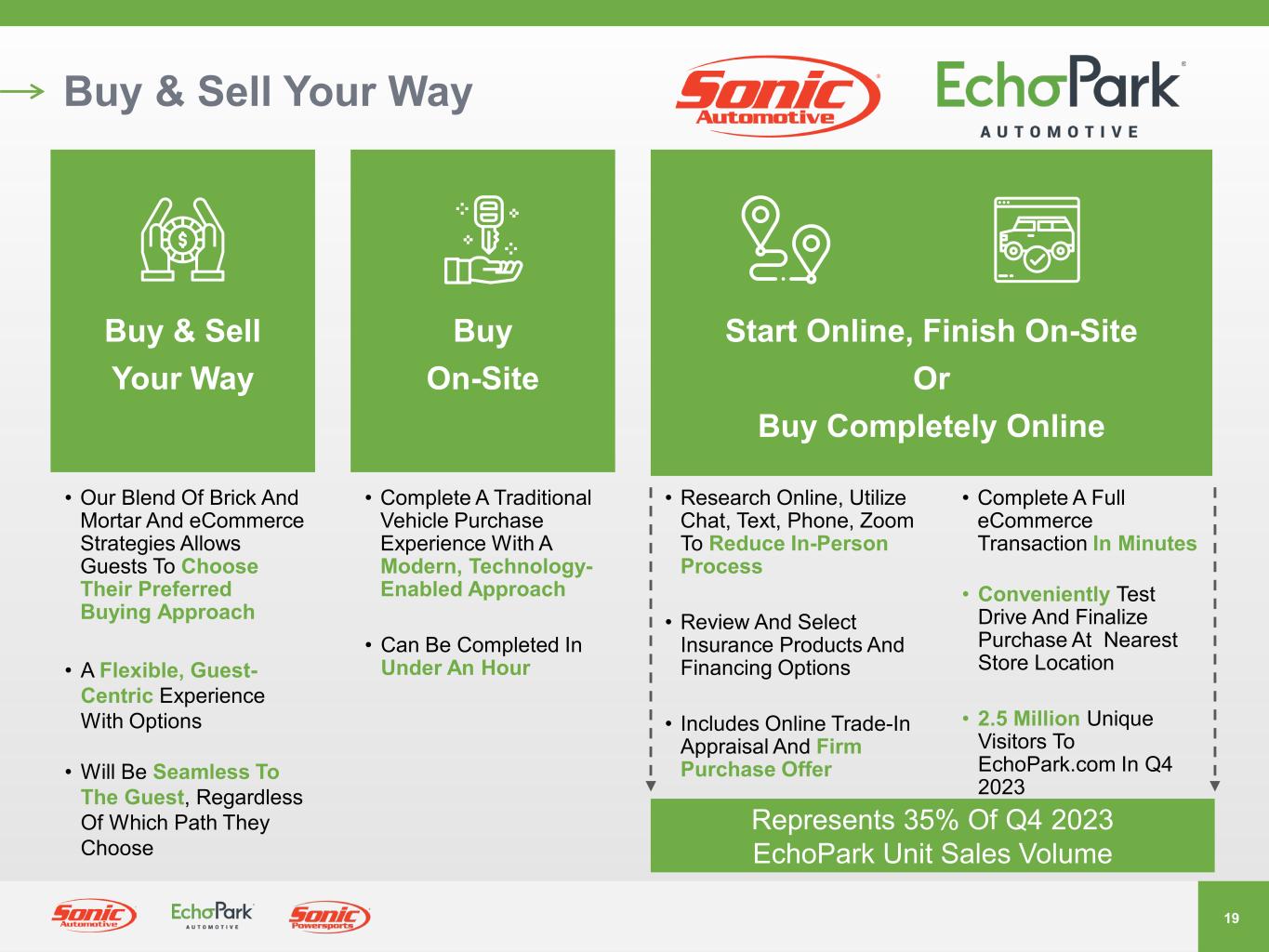 18 EchoPark – Brand Promise Up To 40% Below New Vehicle Price Up To $3,000 Below Used Vehicle Market Price High Quality Pre-Owned Vehicles With Available Warranty Transparent Guest-Centric Experience New Car Feel Without The New Car Price Complete Purchase In Under An Hour Free CARFAX Report With Every Vehicle Buy & Sell Your Way – On-Site Or Online P r i c e . Q u a l i t y. E x p e r i e n c e . L o w C o s t O m n i c h a n n e l M o d e l