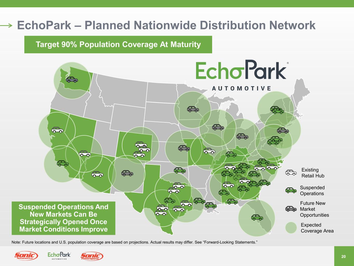 19 Buy & Sell Your Way • Complete A Traditional Vehicle Purchase Experience With A Modern, Technology- Enabled Approach • Can Be Completed In Under An Hour • Research Online, Utilize Chat, Text, Phone, Zoom To Reduce In-Person Process • Review And Select Insurance Products And Financing Options • Includes Online Trade-In Appraisal And Firm Purchase Offer • Complete A Full eCommerce Transaction In Minutes • Conveniently Test Drive And Finalize Purchase At Nearest Store Location • 2.5 Million Unique Visitors To EchoPark.com In Q4 2023 Buy & Sell Your Way Start Online, Finish On-Site Or Buy Completely Online Buy On-Site • Our Blend Of Brick And Mortar And eCommerce Strategies Allows Guests To Choose Their Preferred Buying Approach • A Flexible, Guest- Centric Experience With Options • Will Be Seamless To The Guest, Regardless Of Which Path They Choose Represents 35% Of Q4 2023 EchoPark Unit Sales Volume