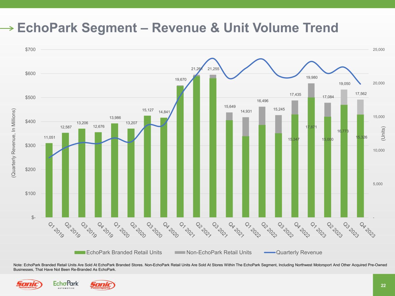 21 EchoPark – Addressable Market Opportunity * Share Of Vehicles That Fit Core1-4-Year-Old Model In Existing EchoPark Markets Plan To Achieve 90% Population Coverage At Maturity Once Market Conditions Improve Target 10% Market Share Already Achieving This Share* In Most Mature Market Priced Up to $3,000 Below Market Price Competes On Price vs. Older Vehicles, Consumer Can Buy Newer Vehicle For Same Price Pricing Up To 40% Below New Converts Prospective New Car Buyers 2 MILLION Opportunity 15+ MILLION 1–4-Year-Old Vehicles 10+ MILLION 5–8-Year- Old Vehicles 13+ MILLION New Vehicles Long-Term Strategy Remains Focused On Nearly-New, 1–4-Year-Old Vehicle Segment Despite Recent Strategic Adjustments To Include 5+ Year-Old Inventory Annual Retail Vehicle Sales Volume Note: Annual Retail Vehicle Sales Volume, EchoPark Volume Opportunity, Population Coverage And Market Share Targets Are Based On Projections. Actual Results May Differ. See “Forward-Looking Statements.”