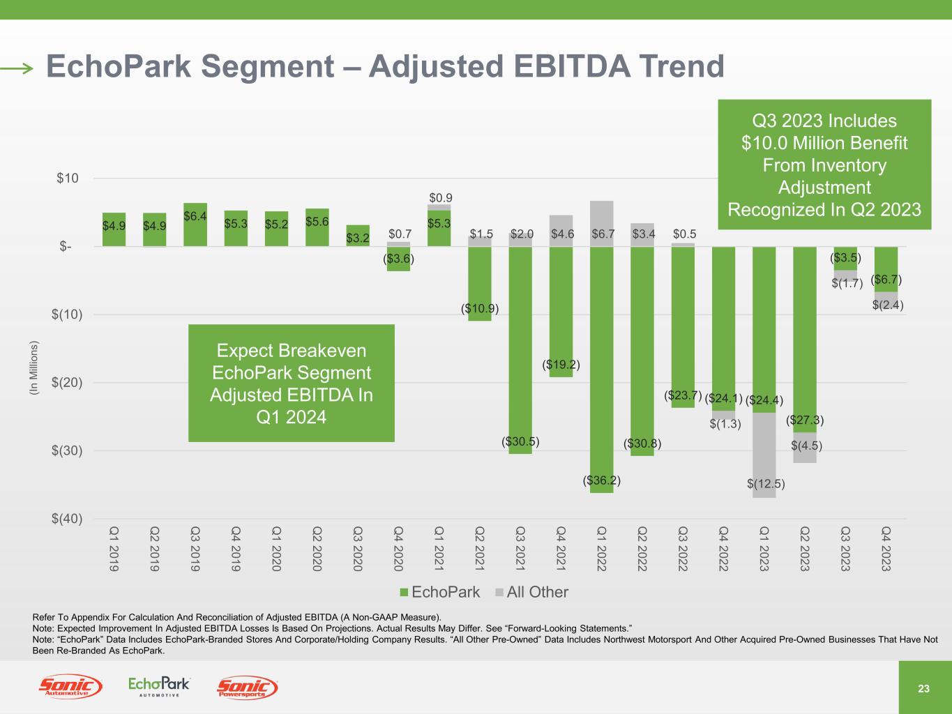 22 EchoPark Segment – Revenue & Unit Volume Trend 15,347 17,871 15,000 16,773 15,32611,051 12,587 13,206 12,676 13,986 13,207 15,127 14,841 19,670 21,261 21,255 15,649 14,931 16,496 15,245 17,435 19,980 17,084 19,050 17,562 - 5,000 10,000 15,000 20,000 25,000 $- $100 $200 $300 $400 $500 $600 $700 (U ni ts ) (Q ua rte rly R ev en ue , I n M illi on s) EchoPark Branded Retail Units Non-EchoPark Retail Units Quarterly Revenue Note: EchoPark Branded Retail Units Are Sold At EchoPark Branded Stores. Non-EchoPark Retail Units Are Sold At Stores Within The EchoPark Segment, Including Northwest Motorsport And Other Acquired Pre-Owned Businesses, That Have Not Been Re-Branded As EchoPark.