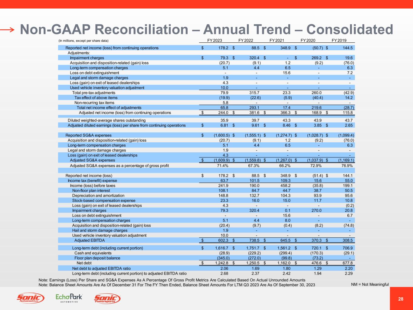27 GAAP Income Statement Annual Trend – Consolidated NM = Not MeaningfulNote: Earnings (Loss) Per Share and Gross Profit Per Unit Metrics Are Calculated Based On Actual Unrounded Amounts FY 2023 Better / (Worse) % Change (In millions, except unit, per unit, and per share data) FY 2023 FY 2022 FY 2021 FY 2020 FY 2019 Year-Over-Year Revenues: Retail new vehicles 6,304.6$ 5,622.6$ 4,993.4$ 4,224.4$ 4,777.3$ 12% Fleet new vehicles 92.2 99.4 124.6 56.8 111.9 (7%) Total new vehicles 6,396.8 5,722.0 5,118.0 4,281.2 4,889.2 12% Used vehicles 5,213.6 5,515.4 4,933.6 3,604.2 3,490.0 (5%) Wholesale vehicles 318.8 484.9 367.2 197.4 202.8 (34%) Total vehicles 11,929.2 11,722.3 10,418.8 8,082.8 8,582.0 2% Parts, service and collision repair 1,759.5 1,599.7 1,340.4 1,194.3 1,395.3 10% Finance, insurance and other, net ("F&I") 683.7 679.1 637.2 489.9 477.0 1% Total revenues 14,372.4 14,001.1 12,396.4 9,767.0 10,454.3 3% Gross profit: Retail new vehicles 535.4 662.8 459.8 233.2 231.7 (19%) Fleet new vehicles 4.0 4.9 1.6 0.9 1.4 (18%) Total new vehicles 539.4 667.7 461.4 234.1 233.1 (19%) Used vehicles 151.2 180.8 133.0 105.2 147.4 (16%) Wholesale vehicles (2.6) (3.1) 9.6 0.1 (4.5) 16% Total vehicles 688.0 845.4 604.0 339.4 376.0 (19%) Parts, service and collision repair 874.0 792.5 673.1 594.3 668.0 10% Finance, insurance and other, net 683.7 679.1 637.2 489.9 477.0 1% Total gross profit 2,245.7 2,317.0 1,914.3 1,423.6 1,521.0 (3%) SG&A expenses (1,600.5) (1,555.1) (1,274.7) (1,028.7) (1,099.4) (3%) Impairment charges (79.3) (320.4) (0.1) (270.0) (20.8) NM Depreciation and amortization (142.3) (127.5) (101.1) (91.0) (93.1) (12%) Operating income (loss) 423.6 314.0 538.4 33.9 307.7 35% Interest expense, floor plan (67.2) (34.3) (16.7) (27.2) (48.5) (96%) Interest expense, other, net (114.6) (89.9) (48.0) (41.6) (53.0) (27%) Other income (expense), net 0.1 0.2 (15.5) 0.1 (6.6) NM Income (loss) from continuing operations before taxes 241.9 190.0 458.2 (34.8) 199.6 27% Income tax benefit (expense) (63.7) (101.5) (109.3) (15.9) (55.1) 37% Net income (loss) from continuing operations 178.2$ 88.5$ 348.9$ (50.7)$ 144.5$ 101% Diluted weighted-average shares outstanding 35.9 39.7 43.3 42.5 43.7 10% Diluted earnings (loss) per share from continuing operations 4.97$ 2.23$ 8.06$ (1.19)$ 3.31$ 123% Unit sales volume: Retail new vehicles 112,110 101,168 99,943 91,939 111,457 11% Fleet new vehicles 2,000 2,115 3,543 1,342 2,674 (5%) Used vehicles 176,147 173,209 183,292 159,025 162,149 2% Wholesale vehicles 32,330 35,323 36,795 32,057 34,153 (8%) Gross profit per unit ("GPU"): Retail new vehicles 4,776$ 6,552$ 4,600$ 2,536$ 2,078$ (27%) Used vehicles 859$ 1,043$ 720$ 667$ 909$ (18%) F&I 2,372$ 2,475$ 2,250$ 1,952$ 1,743$ (4%)