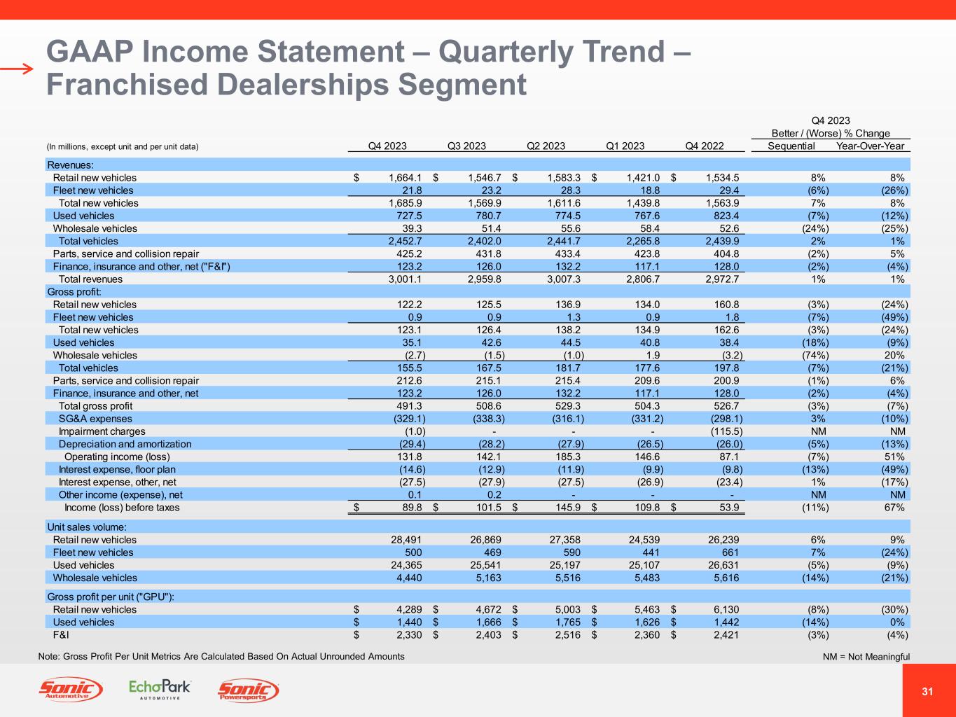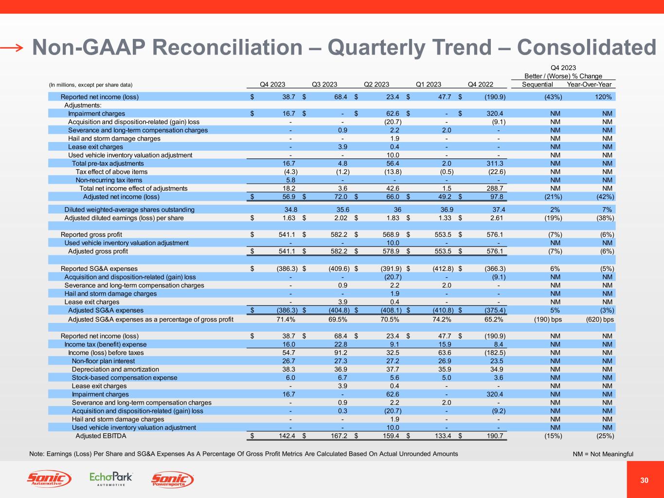 29 GAAP Income Statement Quarterly Trend – Consolidated NM = Not MeaningfulNote: Earnings (Loss) Per Share and Gross Profit Per Unit Metrics Are Calculated Based On Actual Unrounded Amounts Q4 2023 Better / (Worse) % Change (In millions, except unit, per unit, and per share data) Q4 2023 Q3 2023 Q2 2023 Q1 2023 Q4 2022 Sequential Year-Over-Year Revenues: Retail new vehicles 1,680.2$ 1,573.5$ 1,608.2$ 1,442.8$ 1,555.3$ 7% 8% Fleet new vehicles 21.8 23.2 28.3 18.8 29.3 (6%) (26%) Total new vehicles 1,702.0 1,596.7 1,636.5 1,461.6 1,584.6 7% 7% Used vehicles 1,222.4 1,340.4 1,305.9 1,344.9 1,341.1 (9%) (9%) Wholesale vehicles 62.6 79.3 91.5 85.6 80.0 (21%) (22%) Total vehicles 2,987.0 3,016.4 3,033.9 2,892.1 3,005.7 (1%) (1%) Parts, service and collision repair 431.9 453.4 443.7 430.5 411.1 (5%) 5% Finance, insurance and other, net ("F&I") 166.0 173.7 175.3 168.6 173.8 (4%) (4%) Total revenues 3,584.9 3,643.5 3,652.9 3,491.2 3,590.6 (2%) 0% Gross profit: Retail new vehicles 124.5 131.4 141.4 138.1 164.6 (5%) (24%) Fleet new vehicles 0.9 0.9 1.3 0.9 1.8 (7%) (49%) Total new vehicles 125.4 132.3 142.7 139.0 166.4 (5%) (25%) Used vehicles 37.5 52.3 31.5 30.0 35.5 (28%) 6% Wholesale vehicles (3.2) (1.4) (1.0) 3.0 (3.7) (121%) 10% Total vehicles 159.7 183.2 173.2 172.0 198.2 (13%) (19%) Parts, service and collision repair 215.4 225.3 220.4 212.9 204.1 (4%) 6% Finance, insurance and other, net 166.0 173.7 175.3 168.6 173.8 (4%) (4%) Total gross profit 541.1 582.2 568.9 553.5 576.1 (7%) (6%) SG&A expenses (386.3) (409.6) (391.9) (412.8) (366.3) 6% (5%) Impairment charges (16.7) - (62.6) - (320.4) NM NM Depreciation and amortization (36.6) (35.2) (36.1) (34.3) (33.5) (4%) (9%) Operating income (loss) 101.5 137.4 78.3 106.4 (144.1) (26%) 170% Interest expense, floor plan (18.4) (17.4) (17.0) (14.6) (13.6) (6%) (35%) Interest expense, other, net (28.3) (29.0) (28.9) (28.4) (24.9) 2% (14%) Other income (expense), net (0.1) 0.2 0.1 0.2 0.1 NM NM Income (loss) before taxes 54.7 91.2 32.5 63.6 (182.5) (40%) 130% Income tax benefit (expense) (16.0) (22.8) (9.1) (15.9) (8.4) 30% (90%) Net income (loss) 38.7$ 68.4$ 23.4$ 47.7$ (190.9)$ (43%) 120% Diluted weighted-average shares outstanding 34.8 35.6 36 36.9 36.5 2% 5% Diluted earnings (loss) per share 1.11$ 1.92$ 0.65$ 1.29$ (5.22)$ (42%) 121% Unit sales volume: Retail new vehicles 29,439 28,260 28,754 25,657 27,278 4% 8% Fleet new vehicles 500 469 590 441 661 7% (24%) Used vehicles 42,216 45,428 42,972 45,531 44,303 (7%) (5%) Wholesale vehicles 7,127 7,996 8,801 8,406 8,094 (11%) (12%) Gross profit per unit ("GPU"): Retail new vehicles 4,230$ 4,649$ 4,918$ 5,381$ 6,034$ (9%) (30%) Used vehicles 888$ 1,150$ 732$ 660$ 800$ (23%) 11% F&I 2,317$ 2,357$ 2,445$ 2,369$ 2,428$ (2%) (5%)