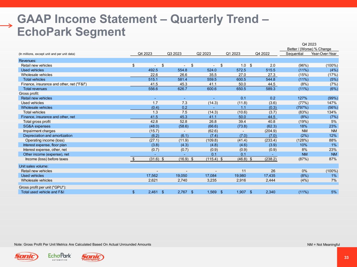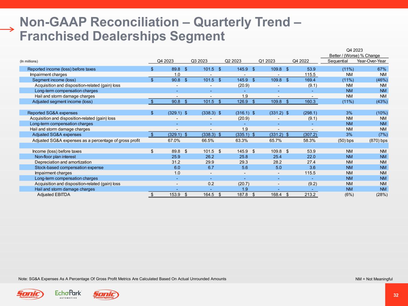 31 GAAP Income Statement – Quarterly Trend – Franchised Dealerships Segment NM = Not MeaningfulNote: Gross Profit Per Unit Metrics Are Calculated Based On Actual Unrounded Amounts Q4 2023 Better / (Worse) % Change (In millions, except unit and per unit data) Q4 2023 Q3 2023 Q2 2023 Q1 2023 Q4 2022 Sequential Year-Over-Year Revenues: Retail new vehicles 1,664.1$ 1,546.7$ 1,583.3$ 1,421.0$ 1,534.5$ 8% 8% Fleet new vehicles 21.8 23.2 28.3 18.8 29.4 (6%) (26%) Total new vehicles 1,685.9 1,569.9 1,611.6 1,439.8 1,563.9 7% 8% Used vehicles 727.5 780.7 774.5 767.6 823.4 (7%) (12%) Wholesale vehicles 39.3 51.4 55.6 58.4 52.6 (24%) (25%) Total vehicles 2,452.7 2,402.0 2,441.7 2,265.8 2,439.9 2% 1% Parts, service and collision repair 425.2 431.8 433.4 423.8 404.8 (2%) 5% Finance, insurance and other, net ("F&I") 123.2 126.0 132.2 117.1 128.0 (2%) (4%) Total revenues 3,001.1 2,959.8 3,007.3 2,806.7 2,972.7 1% 1% Gross profit: Retail new vehicles 122.2 125.5 136.9 134.0 160.8 (3%) (24%) Fleet new vehicles 0.9 0.9 1.3 0.9 1.8 (7%) (49%) Total new vehicles 123.1 126.4 138.2 134.9 162.6 (3%) (24%) Used vehicles 35.1 42.6 44.5 40.8 38.4 (18%) (9%) Wholesale vehicles (2.7) (1.5) (1.0) 1.9 (3.2) (74%) 20% Total vehicles 155.5 167.5 181.7 177.6 197.8 (7%) (21%) Parts, service and collision repair 212.6 215.1 215.4 209.6 200.9 (1%) 6% Finance, insurance and other, net 123.2 126.0 132.2 117.1 128.0 (2%) (4%) Total gross profit 491.3 508.6 529.3 504.3 526.7 (3%) (7%) SG&A expenses (329.1) (338.3) (316.1) (331.2) (298.1) 3% (10%) Impairment charges (1.0) - - - (115.5) NM NM Depreciation and amortization (29.4) (28.2) (27.9) (26.5) (26.0) (5%) (13%) Operating income (loss) 131.8 142.1 185.3 146.6 87.1 (7%) 51% Interest expense, floor plan (14.6) (12.9) (11.9) (9.9) (9.8) (13%) (49%) Interest expense, other, net (27.5) (27.9) (27.5) (26.9) (23.4) 1% (17%) Other income (expense), net 0.1 0.2 - - - NM NM Income (loss) before taxes 89.8$ 101.5$ 145.9$ 109.8$ 53.9$ (11%) 67% Unit sales volume: Retail new vehicles 28,491 26,869 27,358 24,539 26,239 6% 9% Fleet new vehicles 500 469 590 441 661 7% (24%) Used vehicles 24,365 25,541 25,197 25,107 26,631 (5%) (9%) Wholesale vehicles 4,440 5,163 5,516 5,483 5,616 (14%) (21%) Gross profit per unit ("GPU"): Retail new vehicles 4,289$ 4,672$ 5,003$ 5,463$ 6,130$ (8%) (30%) Used vehicles 1,440$ 1,666$ 1,765$ 1,626$ 1,442$ (14%) 0% F&I 2,330$ 2,403$ 2,516$ 2,360$ 2,421$ (3%) (4%)