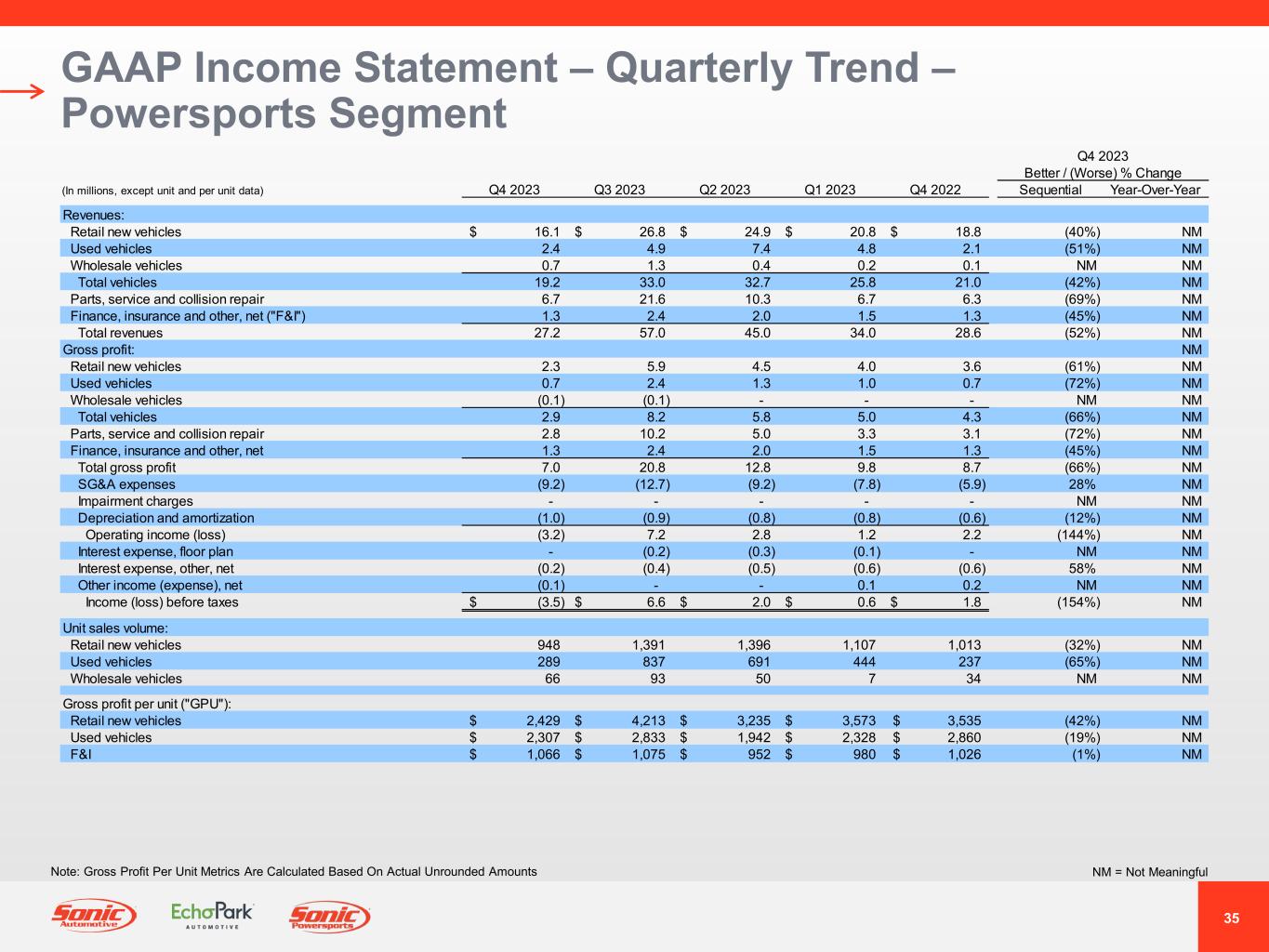 33 GAAP Income Statement – Quarterly Trend – EchoPark Segment NM = Not MeaningfulNote: Gross Profit Per Unit Metrics Are Calculated Based On Actual Unrounded Amounts Q4 2023 Better / (Worse) % Change (In millions, except unit and per unit data) Q4 2023 Q3 2023 Q2 2023 Q1 2023 Q4 2022 Sequential Year-Over-Year Revenues: Retail new vehicles -$ -$ -$ 1.0$ 2.0$ (96%) (100%) Used vehicles 492.5 554.8 524.0 572.5 515.5 (11%) (4%) Wholesale vehicles 22.6 26.6 35.5 27.0 27.3 (15%) (17%) Total vehicles 515.1 581.4 559.5 600.5 544.8 (11%) (5%) Finance, insurance and other, net ("F&I") 41.5 45.3 41.1 50.0 44.5 (8%) (7%) Total revenues 556.6 626.7 600.6 650.5 589.3 (11%) (6%) Gross profit: Retail new vehicles - - - 0.1 0.2 127% (99%) Used vehicles 1.7 7.3 (14.3) (11.8) (3.6) (77%) 147% Wholesale vehicles (0.4) 0.2 - 1.1 (0.3) (797%) (56%) Total vehicles 1.3 7.5 (14.3) (10.6) (3.7) (83%) 134% Finance, insurance and other, net 41.5 45.3 41.1 50.0 44.5 (8%) (7%) Total gross profit 42.8 52.8 26.8 39.4 40.8 (19%) 5% SG&A expenses (48.0) (58.6) (66.6) (73.8) (62.3) 18% 23% Impairment charges (15.7) - (62.6) - (204.9) NM NM Depreciation and amortization (6.2) (6.1) (7.4) (7.0) (7.0) (2%) 12% Operating income (loss) (27.1) (11.9) (109.8) (41.4) (233.4) (128%) 88% Interest expense, floor plan (3.8) (4.3) (4.8) (4.6) (3.9) 10% 1% Interest expense, other, net (0.7) (0.7) (0.9) (0.9) (0.9) 8% 23% Other income (expense), net - - 0.1 0.1 - NM NM Income (loss) before taxes (31.6)$ (16.9)$ (115.4)$ (46.8)$ (238.2)$ (87%) 87% Unit sales volume: Retail new vehicles - - - 11 26 0% (100%) Used vehicles 17,562 19,050 17,084 19,980 17,435 (8%) 1% Wholesale vehicles 2,621 2,740 3,235 2,916 2,444 (4%) 7% Gross profit per unit ("GPU"): Total used vehicle and F&I 2,461$ 2,767$ 1,569$ 1,907$ 2,340$ (11%) 5%