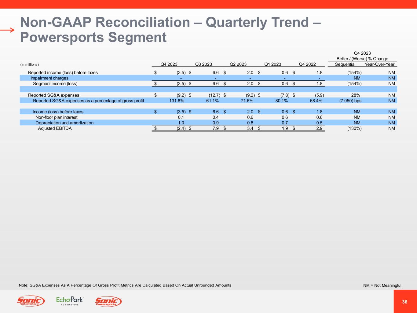 35 GAAP Income Statement – Quarterly Trend – Powersports Segment NM = Not MeaningfulNote: Gross Profit Per Unit Metrics Are Calculated Based On Actual Unrounded Amounts Q4 2023 Better / (Worse) % Change (In millions, except unit and per unit data) Q4 2023 Q3 2023 Q2 2023 Q1 2023 Q4 2022 Sequential Year-Over-Year Revenues: Retail new vehicles 16.1$ 26.8$ 24.9$ 20.8$ 18.8$ (40%) NM Used vehicles 2.4 4.9 7.4 4.8 2.1 (51%) NM Wholesale vehicles 0.7 1.3 0.4 0.2 0.1 NM NM Total vehicles 19.2 33.0 32.7 25.8 21.0 (42%) NM Parts, service and collision repair 6.7 21.6 10.3 6.7 6.3 (69%) NM Finance, insurance and other, net ("F&I") 1.3 2.4 2.0 1.5 1.3 (45%) NM Total revenues 27.2 57.0 45.0 34.0 28.6 (52%) NM Gross profit: NM Retail new vehicles 2.3 5.9 4.5 4.0 3.6 (61%) NM Used vehicles 0.7 2.4 1.3 1.0 0.7 (72%) NM Wholesale vehicles (0.1) (0.1) - - - NM NM Total vehicles 2.9 8.2 5.8 5.0 4.3 (66%) NM Parts, service and collision repair 2.8 10.2 5.0 3.3 3.1 (72%) NM Finance, insurance and other, net 1.3 2.4 2.0 1.5 1.3 (45%) NM Total gross profit 7.0 20.8 12.8 9.8 8.7 (66%) NM SG&A expenses (9.2) (12.7) (9.2) (7.8) (5.9) 28% NM Impairment charges - - - - - NM NM Depreciation and amortization (1.0) (0.9) (0.8) (0.8) (0.6) (12%) NM Operating income (loss) (3.2) 7.2 2.8 1.2 2.2 (144%) NM Interest expense, floor plan - (0.2) (0.3) (0.1) - NM NM Interest expense, other, net (0.2) (0.4) (0.5) (0.6) (0.6) 58% NM Other income (expense), net (0.1) - - 0.1 0.2 NM NM Income (loss) before taxes (3.5)$ 6.6$ 2.0$ 0.6$ 1.8$ (154%) NM Unit sales volume: Retail new vehicles 948 1,391 1,396 1,107 1,013 (32%) NM Used vehicles 289 837 691 444 237 (65%) NM Wholesale vehicles 66 93 50 7 34 NM NM Gross profit per unit ("GPU"): Retail new vehicles 2,429$ 4,213$ 3,235$ 3,573$ 3,535$ (42%) NM Used vehicles 2,307$ 2,833$ 1,942$ 2,328$ 2,860$ (19%) NM F&I 1,066$ 1,075$ 952$ 980$ 1,026$ (1%) NM