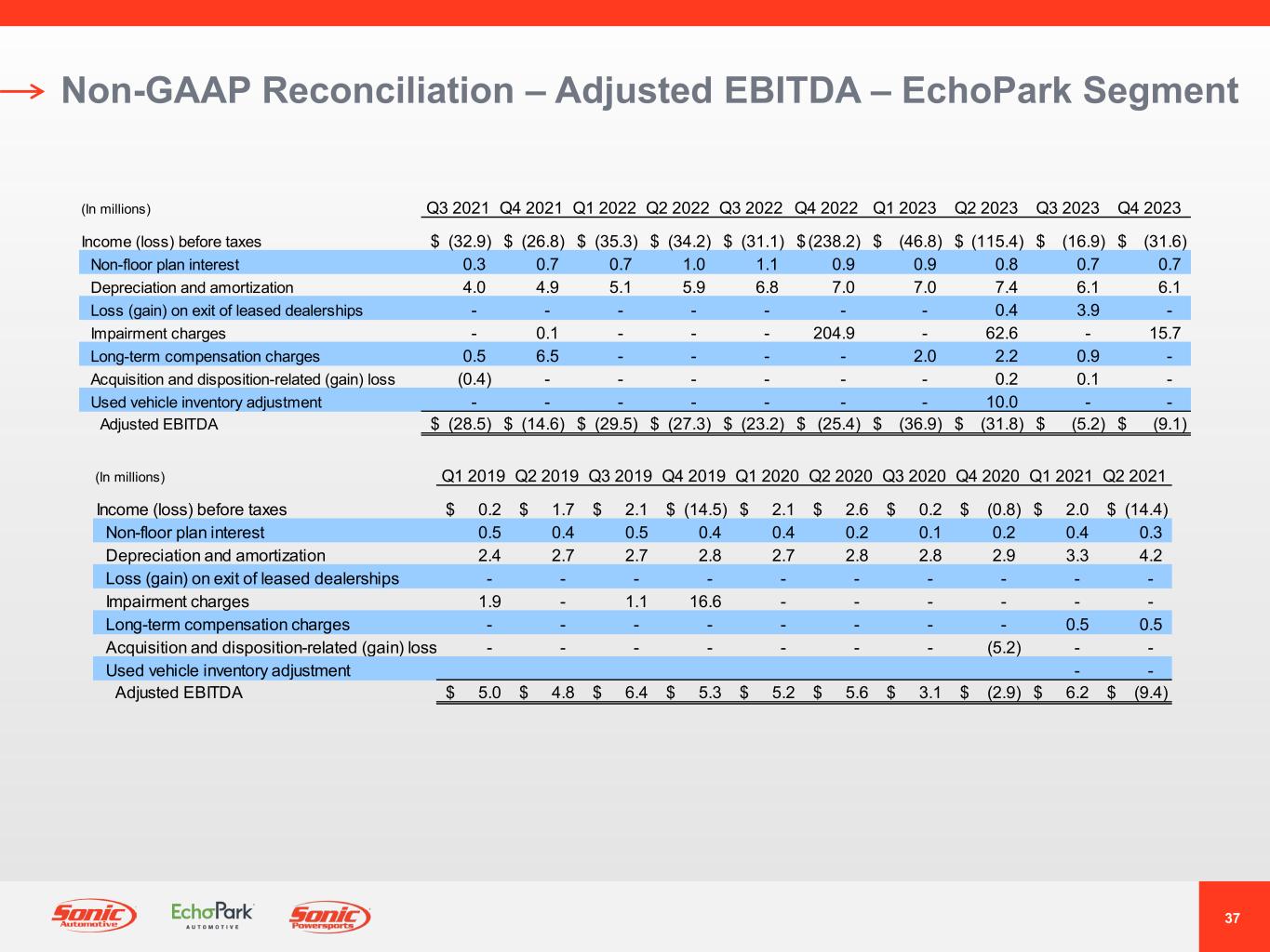 36 Non-GAAP Reconciliation – Quarterly Trend – Powersports Segment NM = Not MeaningfulNote: SG&A Expenses As A Percentage Of Gross Profit Metrics Are Calculated Based On Actual Unrounded Amounts Q4 2023 Better / (Worse) % Change (In millions) Q4 2023 Q3 2023 Q2 2023 Q1 2023 Q4 2022 Sequential Year-Over-Year Reported income (loss) before taxes (3.5)$ 6.6$ 2.0$ 0.6$ 1.8$ (154%) NM Impairment charges - - - - - NM NM Segment income (loss) (3.5)$ 6.6$ 2.0$ 0.6$ 1.8$ (154%) NM Reported SG&A expenses (9.2)$ (12.7)$ (9.2)$ (7.8)$ (5.9)$ 28% NM Reported SG&A expenses as a percentage of gross profit 131.6% 61.1% 71.6% 80.1% 68.4% (7,050) bps NM Income (loss) before taxes (3.5)$ 6.6$ 2.0$ 0.6$ 1.8$ NM NM Non-floor plan interest 0.1 0.4 0.6 0.6 0.6 NM NM Depreciation and amortization 1.0 0.9 0.8 0.7 0.5 NM NM Adjusted EBITDA (2.4)$ 7.9$ 3.4$ 1.9$ 2.9$ (130%) NM