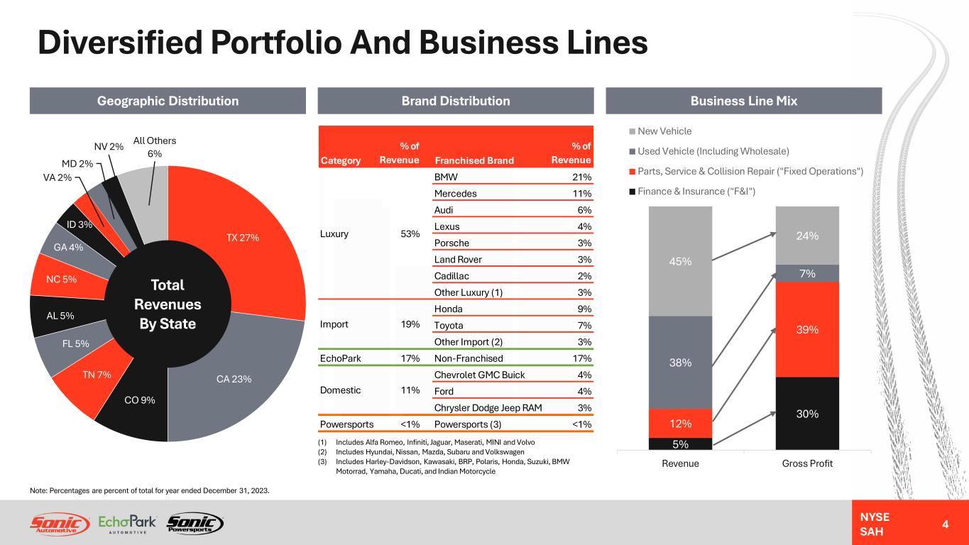 NYSE SAH Forward-Looking Statements This presentation contains “forward-looking statements” within the meaning of the Private Securities Litigation Reform Act of 1995. These statements relate to future events, are not historical facts and are based on our current expectations and assumptions regarding our business, the economy and other future conditions. These statements can generally be identified by lead-in words such as “may,” “will,” “should,” “could,” “believe,” “expect,” “estimate,” “anticipate,” “intend,” “plan,” “project,” “foresee” and other similar words or phrases. Statements that describe our Company’s objectives, plans or goals are also forward-looking statements. Examples of such forward-looking information we may be discussing in this presentation include, without limitation, our anticipated future new vehicle unit sales volume, revenues and profitability, our anticipated future used vehicle unit sales volume, revenues and profitability, future levels of consumer demand for new and used vehicles, our anticipated future parts, service and collision repair (“Fixed Operations”) gross profit, our anticipated future finance and insurance (“F&I”) gross profit, our anticipated expense reductions, long-term annual revenue and profitability targets, anticipated future growth capital expenditures, profitability and pricing expectations in our EchoPark Segment, EchoPark’s omnichannel strategy, anticipated future EchoPark population coverage, anticipated future EchoPark revenue and unit sales volume, anticipated future performance and growth of our Franchised Dealerships Segment, anticipated growth and profitability of our Powersports Segment, anticipated liquidity positions, anticipated industry new vehicle sales volume, the implementation of growth and operating strategies, including acquisitions of dealerships and properties, anticipated future acquisition synergies, the return of capital to stockholders, anticipated future success and impacts from the implementation of our strategic initiatives, and earnings per share expectations. You are cautioned that these forward-looking statements are not guarantees of future performance, involve risks and uncertainties and actual results may differ materially from those projected in the forward-looking statements as a result of various factors. These risks and uncertainties include, without limitation, economic conditions in the markets in which we operate, supply chain disruptions and manufacturing delays, labor shortages, the impacts of inflation and increases in interest rates, new and used vehicle industry sales volume, the success of our operational strategies, the rate and timing of overall economic expansion or contraction, and the risk factors described in the Company’s Annual Report on Form 10-K for the year ended December 31, 2023 and other reports and information filed with the United States Securities and Exchange Commission (the “SEC”). These forward-looking statements, risks, uncertainties and additional factors speak only as of the date of this presentation. We undertake no obligation to update any such statements, except as required under federal securities laws and the rules and regulations of the SEC. 2
