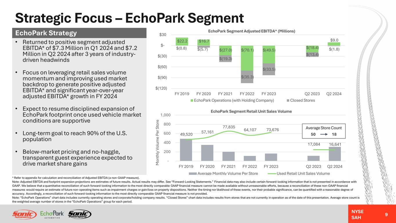 NYSE SAH Strategic Focus – EchoPark Segment • Returned to positive segment adjusted EBITDA* of $7.3 Million in Q1 2024 and $7.2 Million in Q2 2024 after 3 years of industry- driven headwinds • Focus on leveraging retail sales volume momentum and improving used market backdrop to generate positive adjusted EBITDA* and significant year-over-year adjusted EBITDA* growth in FY 2024 • Expect to resume disciplined expansion of EchoPark footprint once used vehicle market conditions are supportive • Long-term goal to reach 90% of the U.S. population • Below-market pricing and no-haggle, transparent guest experience expected to drive market share gains EchoPark Strategy * Refer to appendix for calculation and reconciliation of Adjusted EBITDA (a non-GAAP measure). Note: Adjusted EBITDA and footprint expansion projections are estimates of future results. Actual results may differ. See “Forward-Looking Statements.” Financial data may also include certain forward-looking information that is not presented in accordance with GAAP. We believe that a quantitative reconciliation of such forward-looking information to the most directly comparable GAAP financial measure cannot be made available without unreasonable efforts, because a reconciliation of these non-GAAP financial measures would require an estimate of future non-operating items such as impairment charges or gain/loss on property dispositions. Neither the timing nor likelihood of these events, nor their probable significance, can be quantified with a reasonable degree of accuracy. Accordingly, a reconciliation of such forward-looking information to the most directly comparable GAAP financial measure is not provided. Note: “EchoPark Operations” chart data includes currently operating stores and corporate/holding company results. “Closed Stores” chart data includes results from stores that are not currently in operation as of the date of this presentation. Average store count is the weighted average number of stores in the “EchoPark Operations” group for each period. $22.2 $16.7 $(27.0) $(70.1) $(49.5) $(18.4) $9.0 $(0.8) $(5.7) $(19.3) $(35.3) $(33.5) $(13.4) $(1.8) $(120) $(90) $(60) $(30) $- $30 FY 2019 FY 2020 FY 2021 FY 2022 FY 2023 Q2 2023 Q2 2024 EchoPark Segment Adjusted EBITDA* (Millions) EchoPark Operations (with Holding Company) Closed Stores 49,520 57,161 77,835 64,107 73,676 17,084 16,641 - 200 400 600 800 1,000 FY 2019 FY 2020 FY 2021 FY 2022 FY 2023 Q2 2023 Q2 2024M on th ly V ol um e Pe r S to re EchoPark Segment Retail Unit Sales Volume Average Monthly Volume Per Store Used Retail Unit Sales Volume Average Store Count 50 18 9
