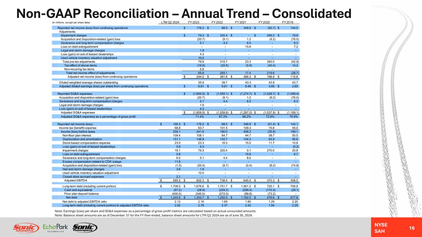 NYSE SAH Non-GAAP Reconciliation – Quarterly Trend – Consolidated 18 NM = Not MeaningfulNote: Earnings (loss) per share and SG&A expenses as a percentage of gross profit metrics are calculated based on actual unrounded amounts. Q2 2024 Better / (Worse) % Change (In millions, except per share data) Q2 2024 Q1 2024 Q4 2023 Q3 2023 Q2 2023 Sequential Year-Over-Year Reported net income (loss) 41.2$ 42.0$ 38.7$ 68.4$ 23.4$ (2%) 76% Adjustments: Impairment charges 1.4$ 1.0$ 16.7$ -$ 62.6$ NM NM Acquisition and disposition-related (gain) loss (0.6) - - - (20.7) NM NM Severance and long-term compensation charges 0.7 4.3 - 0.9 2.2 NM NM Hail and storm damage charges 3.6 - - - 1.9 NM NM Loss (gain) on exit of leased dealerships (3.0) - - 3.9 0.4 NM NM Used vehicle inventory valuation adjustment - - - - 10.0 NM NM Closed store accrued expenses - 2.1 - - - NM NM Excess compensation related to CDK outage 11.6 - - - - NM NM Total pre-tax adjustments 13.7 7.4 16.7 4.8 56.4 NM NM Tax effect of above items (3.6) (1.9) (4.3) (1.2) (13.8) NM NM Non-recurring tax items - - 5.8 - - NM NM Total net income effect of adjustments 10.1 5.5 18.2 3.6 42.6 NM NM Adjusted net income (loss) 51.3$ 47.5$ 56.9$ 72.0$ 66.0$ 8% (22%) Diluted weighted-average shares outstanding 34.9 34.9 34.8 35.6 36.0 0% 3% Adjusted diluted earnings (loss) per share 1.47$ 1.36$ 1.63$ 2.02$ 1.83$ 8% (20%) Reported gross profit 539.1$ 536.2$ 541.1$ 582.2$ 568.9$ 1% (5%) Excess compensation related to CDK outage 2.0 - - - - NM NM Used vehicle inventory valuation adjustment - - - - 10.0 NM NM Adjusted gross profit 541.1$ 536.2$ 541.1$ 582.2$ 578.9$ 1% (7%) Reported SG&A expenses (393.0)$ (392.2)$ (386.3)$ (409.6)$ (391.9)$ 0% 0% Acquisition and disposition-related (gain) loss (0.6) - - - (20.7) NM NM Severance and long-term compensation charges 0.7 4.3 - 0.9 2.2 NM NM Hail and storm damage charges 3.6 - - - 1.9 NM NM Loss (gain) on exit of leased dealerships (3.0) - - 3.9 0.4 NM NM Closed store accrued expenses - 2.1 - - - NM NM Excess compensation related to CDK outage 9.6 - - - - NM NM Adjusted SG&A expenses (382.7)$ (385.8)$ (386.3)$ (404.8)$ (408.1)$ 1% 6% Adjusted SG&A expenses as a percentage of gross profit 70.7% 72.0% 71.4% 69.5% 70.5% 130 bps (20) bps Reported net income (loss) 41.2$ 42.0$ 38.7$ 68.4$ 23.4$ (2%) 76% Income tax (benefit) expense 14.5 15.5 16.0 22.8 9.1 NM NM Income (loss) before taxes 55.7 57.5 54.7 91.2 32.5 (3%) 71% Non-floor plan interest 28.0 27.4 26.7 27.3 27.2 NM NM Depreciation and amortization 38.0 37.9 38.3 36.9 37.7 NM NM Stock-based compensation expense 5.9 4.4 6.0 6.7 5.6 NM NM Loss (gain) on exit of leased dealerships (3.0) - - 3.9 0.4 NM NM Impairment charges 1.4 1.0 16.7 - 62.6 NM NM Loss on debt extinguishment 0.6 - - - - NM NM Severance and long-term compensation charges 0.8 4.3 - 0.9 2.2 NM NM Excess compensation related to CDK outage 11.6 - - - - NM NM Acquisition and disposition-related (gain) loss (1.3) - - 0.3 (20.7) NM NM Closed store accrued expenses - 2.1 - - - NM NM Hail and storm damage charges 3.6 - - - 1.9 NM NM Used vehicle inventory valuation adjustment - - - - 10.0 NM NM Adjusted EBITDA 141.3$ 134.6$ 142.4$ 167.2$ 159.4$ 5% (11%)