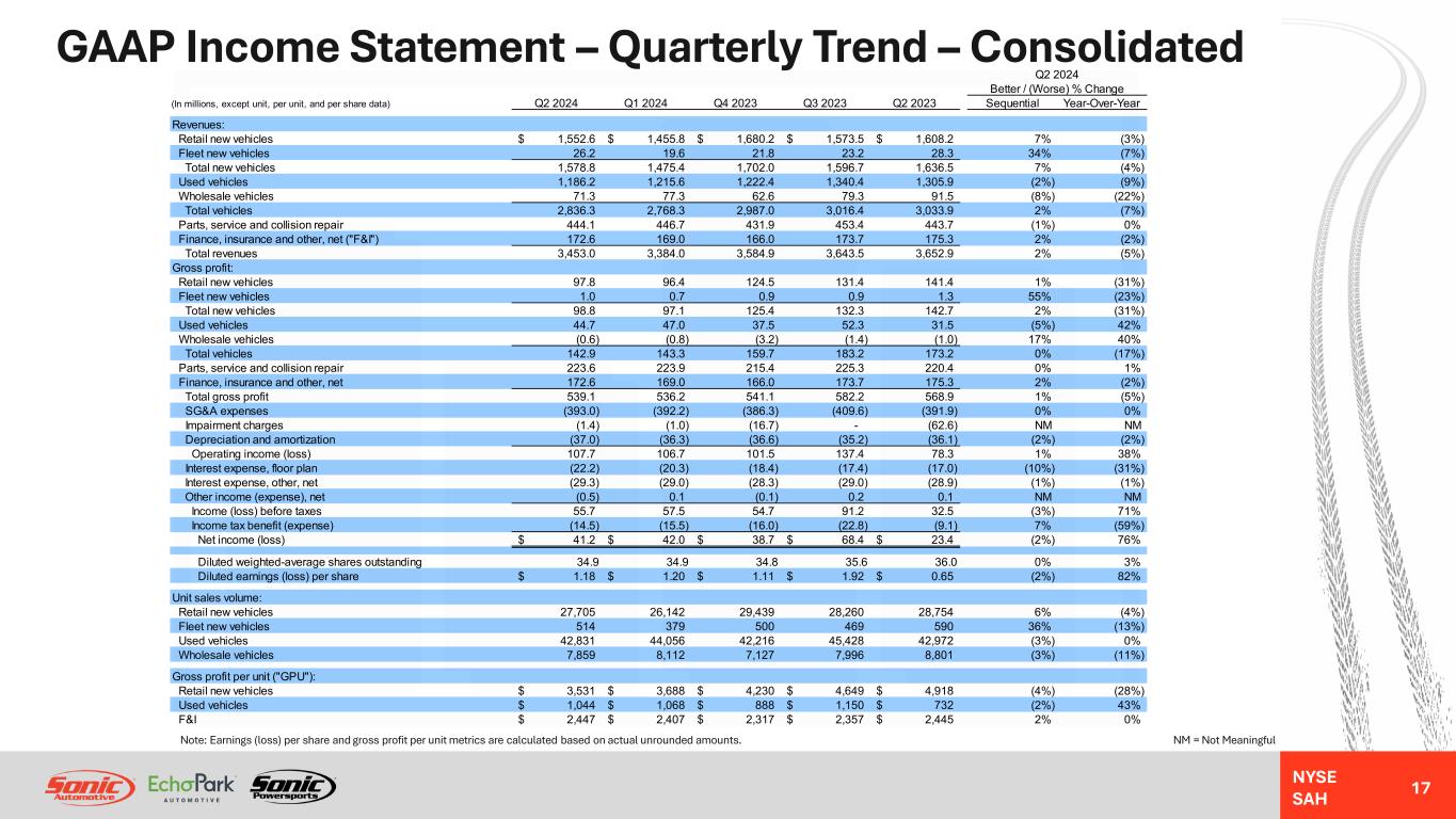 NYSE SAH GAAP Income Statement – Quarterly Trend – Consolidated 17 NM = Not MeaningfulNote: Earnings (loss) per share and gross profit per unit metrics are calculated based on actual unrounded amounts. Q2 2024 Better / (Worse) % Change (In millions, except unit, per unit, and per share data) Q2 2024 Q1 2024 Q4 2023 Q3 2023 Q2 2023 Sequential Year-Over-Year Revenues: Retail new vehicles 1,552.6$ 1,455.8$ 1,680.2$ 1,573.5$ 1,608.2$ 7% (3%) Fleet new vehicles 26.2 19.6 21.8 23.2 28.3 34% (7%) Total new vehicles 1,578.8 1,475.4 1,702.0 1,596.7 1,636.5 7% (4%) Used vehicles 1,186.2 1,215.6 1,222.4 1,340.4 1,305.9 (2%) (9%) Wholesale vehicles 71.3 77.3 62.6 79.3 91.5 (8%) (22%) Total vehicles 2,836.3 2,768.3 2,987.0 3,016.4 3,033.9 2% (7%) Parts, service and collision repair 444.1 446.7 431.9 453.4 443.7 (1%) 0% Finance, insurance and other, net ("F&I") 172.6 169.0 166.0 173.7 175.3 2% (2%) Total revenues 3,453.0 3,384.0 3,584.9 3,643.5 3,652.9 2% (5%) Gross profit: Retail new vehicles 97.8 96.4 124.5 131.4 141.4 1% (31%) Fleet new vehicles 1.0 0.7 0.9 0.9 1.3 55% (23%) Total new vehicles 98.8 97.1 125.4 132.3 142.7 2% (31%) Used vehicles 44.7 47.0 37.5 52.3 31.5 (5%) 42% Wholesale vehicles (0.6) (0.8) (3.2) (1.4) (1.0) 17% 40% Total vehicles 142.9 143.3 159.7 183.2 173.2 0% (17%) Parts, service and collision repair 223.6 223.9 215.4 225.3 220.4 0% 1% Finance, insurance and other, net 172.6 169.0 166.0 173.7 175.3 2% (2%) Total gross profit 539.1 536.2 541.1 582.2 568.9 1% (5%) SG&A expenses (393.0) (392.2) (386.3) (409.6) (391.9) 0% 0% Impairment charges (1.4) (1.0) (16.7) - (62.6) NM NM Depreciation and amortization (37.0) (36.3) (36.6) (35.2) (36.1) (2%) (2%) Operating income (loss) 107.7 106.7 101.5 137.4 78.3 1% 38% Interest expense, floor plan (22.2) (20.3) (18.4) (17.4) (17.0) (10%) (31%) Interest expense, other, net (29.3) (29.0) (28.3) (29.0) (28.9) (1%) (1%) Other income (expense), net (0.5) 0.1 (0.1) 0.2 0.1 NM NM Income (loss) before taxes 55.7 57.5 54.7 91.2 32.5 (3%) 71% Income tax benefit (expense) (14.5) (15.5) (16.0) (22.8) (9.1) 7% (59%) Net income (loss) 41.2$ 42.0$ 38.7$ 68.4$ 23.4$ (2%) 76% Diluted weighted-average shares outstanding 34.9 34.9 34.8 35.6 36.0 0% 3% Diluted earnings (loss) per share 1.18$ 1.20$ 1.11$ 1.92$ 0.65$ (2%) 82% Unit sales volume: Retail new vehicles 27,705 26,142 29,439 28,260 28,754 6% (4%) Fleet new vehicles 514 379 500 469 590 36% (13%) Used vehicles 42,831 44,056 42,216 45,428 42,972 (3%) 0% Wholesale vehicles 7,859 8,112 7,127 7,996 8,801 (3%) (11%) Gross profit per unit ("GPU"): Retail new vehicles 3,531$ 3,688$ 4,230$ 4,649$ 4,918$ (4%) (28%) Used vehicles 1,044$ 1,068$ 888$ 1,150$ 732$ (2%) 43% F&I 2,447$ 2,407$ 2,317$ 2,357$ 2,445$ 2% 0%