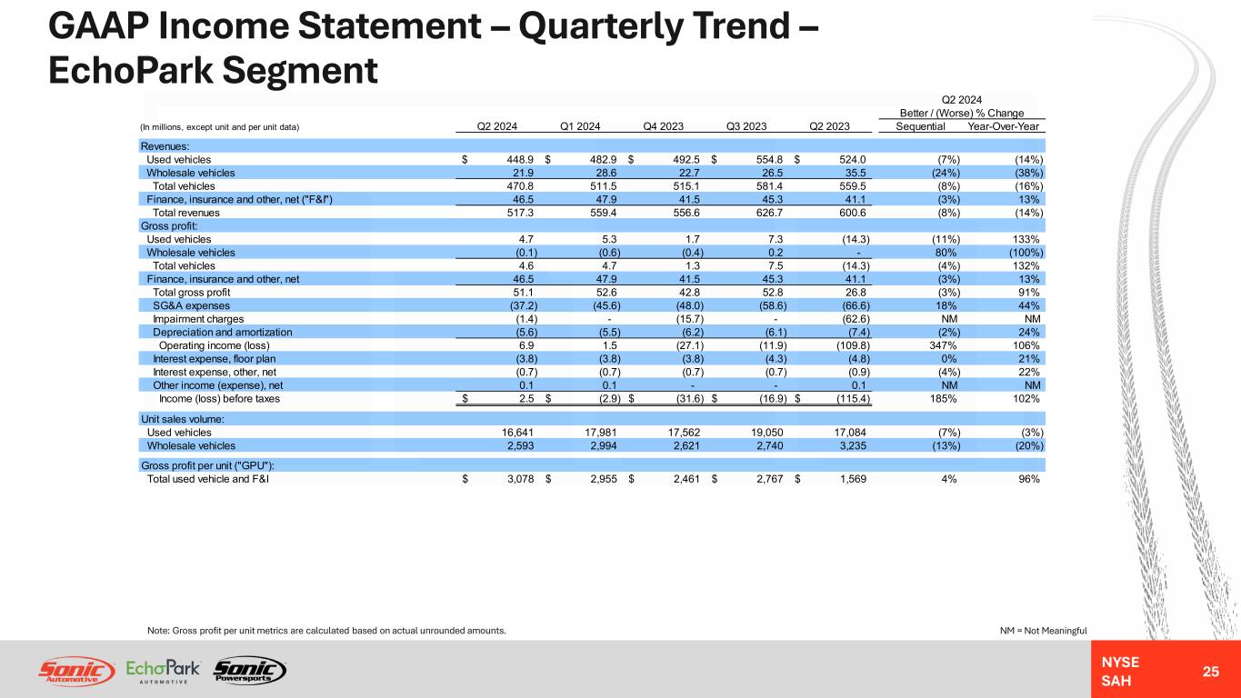 NYSE SAH GAAP Income Statement – Annual Trend – EchoPark Segment 23 NM = Not MeaningfulNote: Gross profit per unit metrics are calculated based on actual unrounded amounts. FY 2023 Better / (Worse) % Change (In millions, except unit, per unit, and per share data) FY 2023 FY 2022 FY 2021 FY 2020 FY 2019 Year-Over-Year Revenues: Total new vehicles 1.0$ 9.2$ 9.0$ -$ -$ (89%) Used vehicles 2,143.8 2,116.8 2,032.6 1,258.2 1,025.3 1% Wholesale vehicles 111.7 170.6 110.0 28.7 22.9 (35%) Total vehicles 2,256.5 2,296.6 2,151.6 1,286.9 1,048.2 (2%) Finance, insurance and other, net ("F&I") 177.9 166.4 193.7 132.1 113.8 7% Total revenues 2,434.4 2,463.0 2,345.3 1,419.0 1,162.0 (1%) Gross profit: Total new vehicles 0.1 1.1 1.1 - - (93%) Used vehicles (17.1) 4.4 (55.2) (18.0) (1.0) (490%) Wholesale vehicles 0.9 3.2 9.2 (0.1) (0.4) (74%) Total vehicles (16.1) 8.7 (44.9) (18.1) (1.4) (286%) Finance, insurance and other, net 177.9 166.4 193.7 132.1 113.8 7% Total gross profit 161.8 175.1 148.8 114.0 112.4 (8%) SG&A expenses (247.0) (269.9) (197.8) (94.9) (87.6) 8% Impairment charges (78.3) (204.9) (0.1) - (19.7) NM Depreciation and amortization (26.6) (24.6) (16.3) (11.0) (10.5) (8%) Operating income (loss) (190.1) (324.3) (65.4) 8.1 (5.4) 41% Interest expense, floor plan (17.4) (10.6) (5.0) (3.2) (3.5) (64%) Interest expense, other, net (3.2) (3.9) (1.7) (0.9) (1.7) 17% Other income (expense), net (0.1) - - - 0.1 NM Income (loss) from continuing operations before taxes (210.8)$ (338.8)$ (72.1)$ 4.0$ (10.5)$ 38% Unit sales volume: Retail new vehicles 11 152 128 - - (93%) Used vehicles 73,676 64,107 77,835 57,161 49,520 15% Wholesale vehicles 11,512 11,236 11,667 7,178 5,774 2% Gross profit per unit ("GPU"): Retail new vehicles 6,934$ 7,510$ 8,303$ N/A N/A (8%) Total used vehicle and F&I 2,183$ 2,657$ 1,762$ 2,013$ 2,296$ (18%)