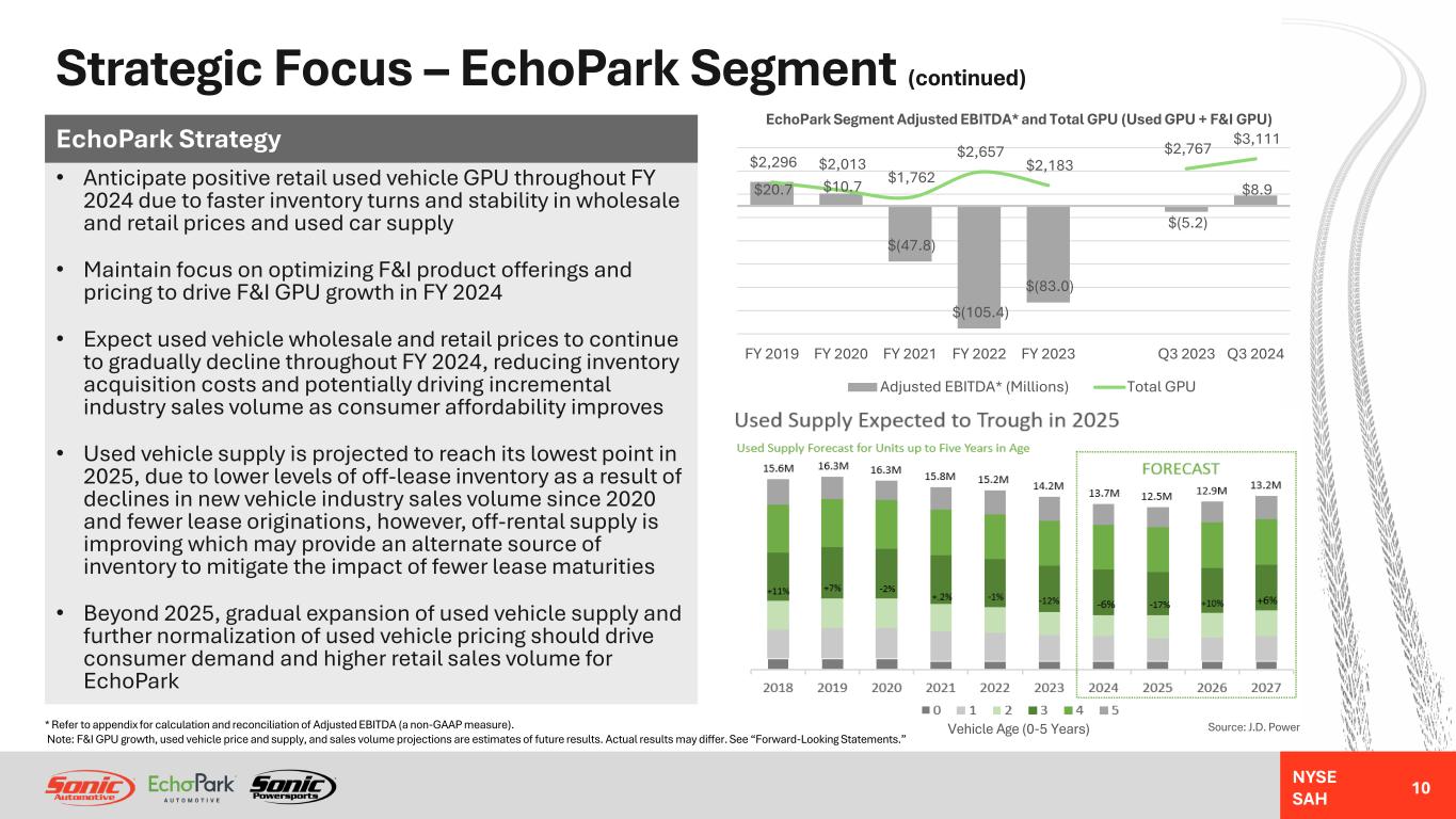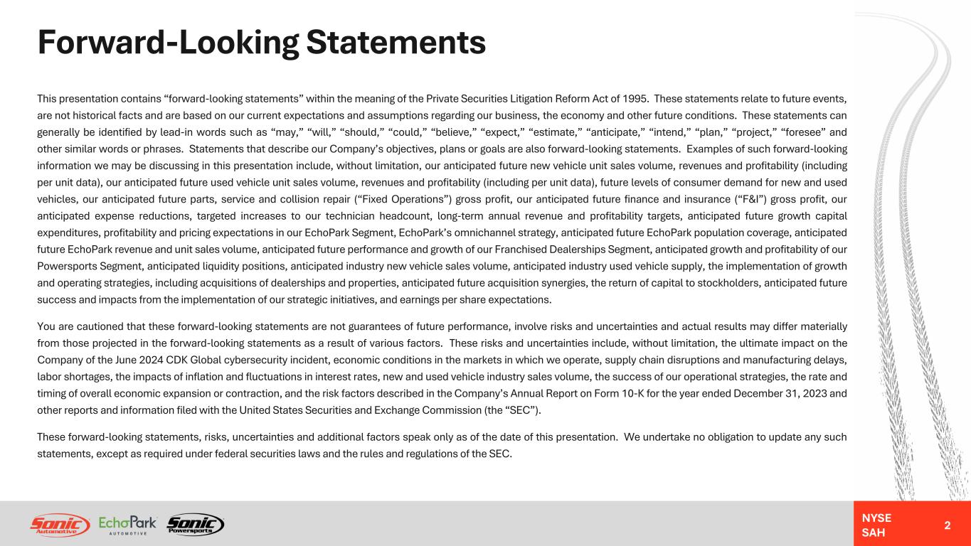 NYSE SAH Forward-Looking Statements This presentation contains “forward-looking statements” within the meaning of the Private Securities Litigation Reform Act of 1995. These statements relate to future events, are not historical facts and are based on our current expectations and assumptions regarding our business, the economy and other future conditions. These statements can generally be identified by lead-in words such as “may,” “will,” “should,” “could,” “believe,” “expect,” “estimate,” “anticipate,” “intend,” “plan,” “project,” “foresee” and other similar words or phrases. Statements that describe our Company’s objectives, plans or goals are also forward-looking statements. Examples of such forward-looking information we may be discussing in this presentation include, without limitation, our anticipated future new vehicle unit sales volume, revenues and profitability (including per unit data), our anticipated future used vehicle unit sales volume, revenues and profitability (including per unit data), future levels of consumer demand for new and used vehicles, our anticipated future parts, service and collision repair (“Fixed Operations”) gross profit, our anticipated future finance and insurance (“F&I”) gross profit, our anticipated expense reductions, targeted increases to our technician headcount, long-term annual revenue and profitability targets, anticipated future growth capital expenditures, profitability and pricing expectations in our EchoPark Segment, EchoPark’s omnichannel strategy, anticipated future EchoPark population coverage, anticipated future EchoPark revenue and unit sales volume, anticipated future performance and growth of our Franchised Dealerships Segment, anticipated growth and profitability of our Powersports Segment, anticipated liquidity positions, anticipated industry new vehicle sales volume, anticipated industry used vehicle supply, the implementation of growth and operating strategies, including acquisitions of dealerships and properties, anticipated future acquisition synergies, the return of capital to stockholders, anticipated future success and impacts from the implementation of our strategic initiatives, and earnings per share expectations. You are cautioned that these forward-looking statements are not guarantees of future performance, involve risks and uncertainties and actual results may differ materially from those projected in the forward-looking statements as a result of various factors. These risks and uncertainties include, without limitation, the ultimate impact on the Company of the June 2024 CDK Global cybersecurity incident, economic conditions in the markets in which we operate, supply chain disruptions and manufacturing delays, labor shortages, the impacts of inflation and fluctuations in interest rates, new and used vehicle industry sales volume, the success of our operational strategies, the rate and timing of overall economic expansion or contraction, and the risk factors described in the Company’s Annual Report on Form 10-K for the year ended December 31, 2023 and other reports and information filed with the United States Securities and Exchange Commission (the “SEC”). These forward-looking statements, risks, uncertainties and additional factors speak only as of the date of this presentation. We undertake no obligation to update any such statements, except as required under federal securities laws and the rules and regulations of the SEC. 2