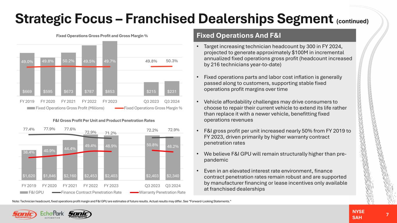NYSE SAH Strategic Focus – Franchised Dealerships Segment (continued) 6 111.5 91.9 99.8 99.4 107.3 26.9 27.4 $42.9 $45.9 $49.9 $56.1 $57.9 $57.6 $56.2 $2,078 $2,536 $4,595 $6,591 $4,836 $4,672 $3,047 FY 2019 FY 2020 FY 2021 FY 2022 FY 2023 Q3 2023 Q3 2024 Retail New Vehicle Unit Sales Volume, Revenue, and Gross Profit Per Unit Unit Sales Volume (Thousands) Revenue Per Unit (Thousands) GPU 112.6 101.9 105.5 108.5 100.2 25.5 24.9 $22.1 $23.0 $27.5 $31.3 $30.4 $30.6 $28.1 $1,310 $1,207 $1,784 $1,607 $1,626 $1,666 $1,386 FY 2019 FY 2020 FY 2021 FY 2022 FY 2023 Q3 2023 Q3 2024 Retail Used Vehicle Unit Sales Volume, Revenue, and Gross Profit Per Unit Unit Sales Volume (Thousands) Revenue Per Unit (Thousands) GPU Retail New And Used Vehicles • While new vehicle GPUs continue to decline, we believe the "new normal" will be significantly higher than pre-pandemic levels • We believe used vehicle GPU may decline over time if we are able to drive higher retail used vehicle unit sales volume by supplementing our inventory levels from wholesale auction sources as off-rental inventory supply returns to normal • Strategic focus to return to selling at least 100 retail used vehicles per store per month, on average (represents approximately 25% improvement in retail used vehicle volume throughput per store) • As new and used vehicle sales volumes recover from pandemic-induced lows, F&I gross profit and fixed operations gross profit should benefit from higher industry retail volume Note: New and used vehicle GPU, sales volume, and F&I and fixed operations gross profit expectations and projections are estimates of future results. Actual results may differ. See “Forward-Looking Statements.”