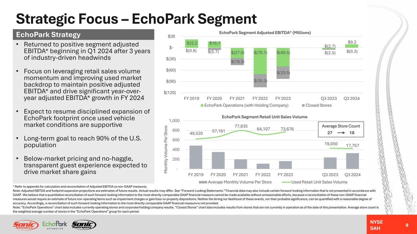NYSE SAH Strategic Focus – EchoPark Segment • Returned to positive segment adjusted EBITDA* beginning in Q1 2024 after 3 years of industry-driven headwinds • Focus on leveraging retail sales volume momentum and improving used market backdrop to maintain positive adjusted EBITDA* and drive significant year-over- year adjusted EBITDA* growth in FY 2024 • Expect to resume disciplined expansion of EchoPark footprint once used vehicle market conditions are supportive • Long-term goal to reach 90% of the U.S. population • Below-market pricing and no-haggle, transparent guest experience expected to drive market share gains EchoPark Strategy * Refer to appendix for calculation and reconciliation of Adjusted EBITDA (a non-GAAP measure). Note: Adjusted EBITDA and footprint expansion projections are estimates of future results. Actual results may differ. See “Forward-Looking Statements.” Financial data may also include certain forward-looking information that is not presented in accordance with GAAP. We believe that a quantitative reconciliation of such forward-looking information to the most directly comparable GAAP financial measure cannot be made available without unreasonable efforts, because a reconciliation of these non-GAAP financial measures would require an estimate of future non-operating items such as impairment charges or gain/loss on property dispositions. Neither the timing nor likelihood of these events, nor their probable significance, can be quantified with a reasonable degree of accuracy. Accordingly, a reconciliation of such forward-looking information to the most directly comparable GAAP financial measure is not provided. Note: “EchoPark Operations” chart data includes currently operating stores and corporate/holding company results. “Closed Stores” chart data includes results from stores that are not currently in operation as of the date of this presentation. Average store count is the weighted average number of stores in the “EchoPark Operations” group for each period. $22.2 $16.7 $(27.0) $(70.1) $(49.5) $(2.7) $9.2 $(0.8) $(5.7) $(19.3) $(35.3) $(33.5) $(2.5) $(0.3) $(120) $(90) $(60) $(30) $- $30 FY 2019 FY 2020 FY 2021 FY 2022 FY 2023 Q3 2023 Q3 2024 EchoPark Segment Adjusted EBITDA* (Millions) EchoPark Operations (with Holding Company) Closed Stores 49,520 57,161 77,835 64,107 73,676 19,050 17,757 - 200 400 600 800 1,000 FY 2019 FY 2020 FY 2021 FY 2022 FY 2023 Q3 2023 Q3 2024M on th ly V ol um e Pe r S to re EchoPark Segment Retail Unit Sales Volume Average Monthly Volume Per Store Used Retail Unit Sales Volume Average Store Count 27 18 9