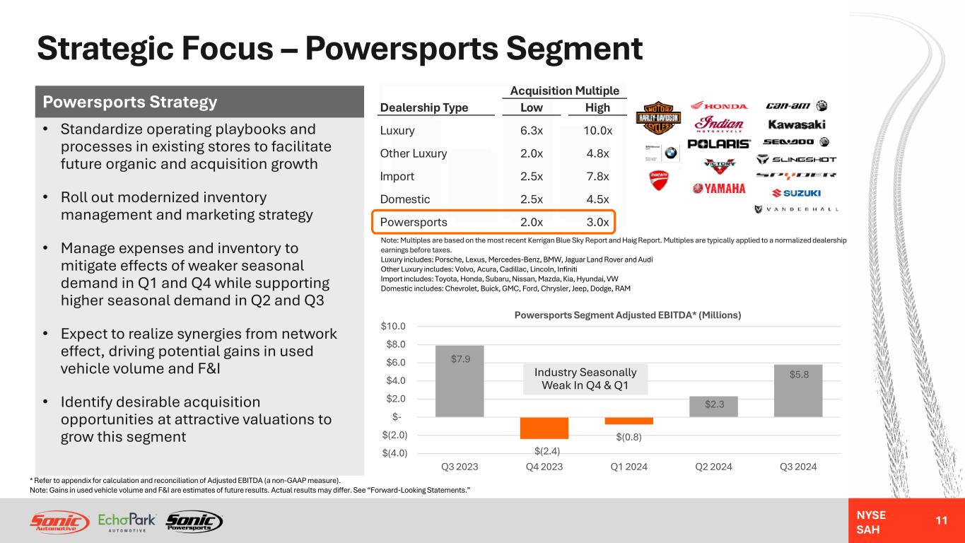 NYSE SAH Strategic Focus – EchoPark Segment (continued) 10 • Anticipate positive retail used vehicle GPU throughout FY 2024 due to faster inventory turns and stability in wholesale and retail prices and used car supply • Maintain focus on optimizing F&I product offerings and pricing to drive F&I GPU growth in FY 2024 • Expect used vehicle wholesale and retail prices to continue to gradually decline throughout FY 2024, reducing inventory acquisition costs and potentially driving incremental industry sales volume as consumer affordability improves • Used vehicle supply is projected to reach its lowest point in 2025, due to lower levels of off-lease inventory as a result of declines in new vehicle industry sales volume since 2020 and fewer lease originations, however, off-rental supply is improving which may provide an alternate source of inventory to mitigate the impact of fewer lease maturities • Beyond 2025, gradual expansion of used vehicle supply and further normalization of used vehicle pricing should drive consumer demand and higher retail sales volume for EchoPark EchoPark Strategy $20.7 $10.7 $(47.8) $(105.4) $(83.0) $(5.2) $8.9 $2,296 $2,013 $1,762 $2,657 $2,183 $2,767 $3,111 FY 2019 FY 2020 FY 2021 FY 2022 FY 2023 Q3 2023 Q3 2024 EchoPark Segment Adjusted EBITDA* and Total GPU (Used GPU + F&I GPU) Adjusted EBITDA* (Millions) Total GPU Source: J.D. PowerVehicle Age (0-5 Years)* Refer to appendix for calculation and reconciliation of Adjusted EBITDA (a non-GAAP measure). Note: F&I GPU growth, used vehicle price and supply, and sales volume projections are estimates of future results. Actual results may differ. See “Forward-Looking Statements.”