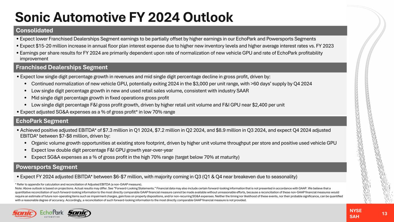 NYSE SAH Strategic Focus – Consolidated Company 12 • Expect to maintain strong balance sheet and free cash flows • Balanced capital allocation strategy prioritizes highest return opportunity • History of returning capital to shareholders via dividend and share repurchases • Quarterly dividend per share has grown 250% since 2019, current forward yield over 2.5% • Reduced outstanding shares by 21% since 2019 ($260 million remaining authorization, or nearly 15% of market cap) • Net debt to adjusted EBITDA ratio* of 2.31 for the 12 months ended Q3 2024 is within our target leverage range Consolidated Company Strategy $29 $244 $399 $501 $374 $418 $280 $526 $703 $794 $846 $834 $- $200 $400 $600 $800 $1,000 12/31/2019 12/31/2020 12/31/2021 12/31/2022 12/31/2023 9/30/2024 $ In M ill io ns Strong Balance Sheet and Liquidity Cash and Floor Plan Deposit Balance Total Liquidity * Refer to appendix for calculation and reconciliation of Net Debt to Adjusted EBITDA Ratio (a non-GAAP measure). Note: Dividend yield and market cap are based on stock price as of October 22, 2024. Note: Balance sheet and free cash flow projections are estimates of future results. Actual results may differ. See “Forward-Looking Statements.” $20 $1,019 $102 $75 $126 $127 $298 $227 $204 $72 $93 $262 $178 $16 $17 $18 $35 $40 FY 2019 FY 2020 FY 2021 FY 2022 FY 2023 $ In M ill io ns Capital Allocation Trend Acquisitions Cap Ex Share Repurchases Dividends Note: Cap Ex represents total purchases of land, property and equipment from consolidated statements of cash flows included in Sonic’s Annual Report on Form 10-K for the applicable fiscal year.