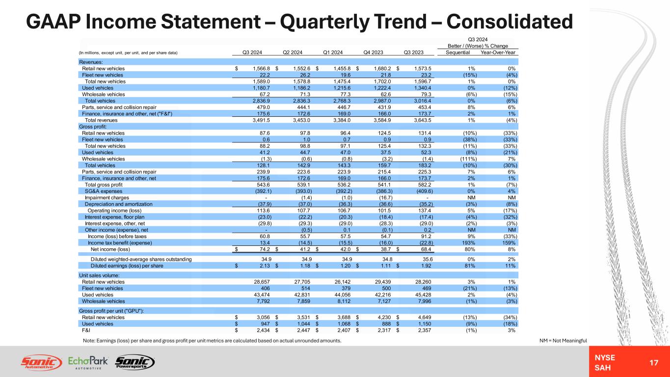 NYSE SAH Non-GAAP Reconciliation – Annual Trend – Consolidated 16 Note: Earnings (loss) per share and SG&A expenses as a percentage of gross profit metrics are calculated based on actual unrounded amounts. Note: Balance sheet amounts are as of December 31 for the FY then ended, balance sheet amounts for LTM Q3 2024 are as of September 30, 2024. (In millions, except per share data) LTM Q3 2024 FY 2023 FY 2022 FY 2021 FY 2020 FY 2019 Reported net income (loss) from continuing operations 178.2$ 88.5$ 348.9$ (50.7)$ 144.5$ Adjustments: Impairment charges 79.3$ 320.4$ -$ 269.2$ 19.6$ Acquisition and disposition-related (gain) loss (20.7) (9.1) 1.2 (9.2) (76.0) Severance and long-term compensation charges 5.1 4.4 6.5 - 6.3 Loss on debt extinguishment - - 15.6 - 7.2 Legal and storm damage charges 1.9 - - - - Loss (gain) on exit of leased dealerships 4.3 - - - - Used vehicle inventory valuation adjustment 10.0 - - - - Total pre-tax adjustments 79.9 315.7 23.3 260.0 (42.9) Tax effect of above items (19.9) (22.6) (5.9) (40.4) 14.2 Non-recurring tax items 5.8 - - - - Total net income effect of adjustments 65.8 293.1 17.4 219.6 (28.7) Adjusted net income (loss) from continuing operations 244.0$ 381.6$ 366.3$ 168.9$ 115.8$ Diluted weighted-average shares outstanding 35.9 39.7 43.3 43.9 43.7 Adjusted diluted earnings (loss) per share from continuing operations 6.81$ 9.61$ 8.46$ 3.85$ 2.65$ Reported SG&A expenses (1,600.5)$ (1,555.1)$ (1,274.7)$ (1,028.7)$ (1,099.4)$ Acquisition and disposition-related (gain) loss (20.7) (9.1) 1.2 (9.2) (76.0) Severance and long-term compensation charges 5.1 4.4 6.5 - 6.3 Legal and storm damage charges 1.9 - - - - Loss (gain) on exit of leased dealerships 4.3 - - - - Adjusted SG&A expenses (1,609.9)$ (1,559.8)$ (1,267.0)$ (1,037.9)$ (1,169.1)$ Adjusted SG&A expenses as a percentage of gross profit 71.4% 67.3% 66.2% 72.9% 76.9% Reported net income (loss) 196.1$ 178.2$ 88.5$ 348.9$ (51.4)$ 144.1$ Income tax (benefit) expense 32.6 63.7 101.5 109.3 15.6 55.0 Income (loss) before taxes 228.7 241.9 190.0 458.2 (35.8) 199.1 Non-floor plan interest 110.5 108.1 84.7 44.7 38.7 50.5 Depreciation and amortization 153.5 148.8 132.7 104.3 93.9 95.6 Stock-based compensation expense 21.8 23.3 16.0 15.0 11.7 10.8 Loss (gain) on exit of leased dealerships (3.0) 4.3 - - - (0.2) Impairment charges 19.1 79.3 320.4 0.1 270.0 20.8 Loss on debt extinguishment 0.6 - - 15.6 - 6.7 Severance and long-term compensation charges 5.1 5.1 4.4 8.0 - - Excess compensation related to CDK outage 13.4 - - - - - Acquisition and disposition-related (gain) loss (3.6) (20.4) (9.7) (0.4) (8.2) (74.8) Hail and storm damage charges 5.1 1.9 - - - - Used vehicle inventory valuation adjustment - 10.0 - - - - Closed store accrued expenses 2.1 - - - - - Adjusted EBITDA 553.3$ 602.3$ 738.5$ 645.5$ 370.3$ 308.5$ Long-term debt (including current portion) 1,695.9$ 1,676.6$ 1,751.7$ 1,561.2$ 720.1$ 706.9$ Cash and equivalents (17.6) (28.9) (229.2) (299.4) (170.3) (29.1) Floor plan deposit balance (400.0) (345.0) (272.0) (99.8) (73.2) - Net debt 1,278.3$ 1,302.7$ 1,250.5$ 1,162.0$ 476.6$ 677.8$ Net debt to adjusted EBITDA ratio 2.31 2.16 1.69 1.80 1.29 2.20 Long-term debt (including current portion) to adjusted EBITDA ratio 3.07 2.78 2.37 2.42 1.94 2.29