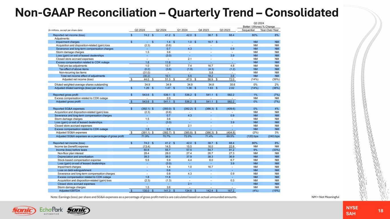 NYSE SAH GAAP Income Statement – Quarterly Trend – Consolidated 17 NM = Not MeaningfulNote: Earnings (loss) per share and gross profit per unit metrics are calculated based on actual unrounded amounts. Q3 2024 Better / (Worse) % Change (In millions, except unit, per unit, and per share data) Q3 2024 Q2 2024 Q1 2024 Q4 2023 Q3 2023 Sequential Year-Over-Year Revenues: Retail new vehicles 1,566.8$ 1,552.6$ 1,455.8$ 1,680.2$ 1,573.5$ 1% 0% Fleet new vehicles 22.2 26.2 19.6 21.8 23.2 (15%) (4%) Total new vehicles 1,589.0 1,578.8 1,475.4 1,702.0 1,596.7 1% 0% Used vehicles 1,180.7 1,186.2 1,215.6 1,222.4 1,340.4 0% (12%) Wholesale vehicles 67.2 71.3 77.3 62.6 79.3 (6%) (15%) Total vehicles 2,836.9 2,836.3 2,768.3 2,987.0 3,016.4 0% (6%) Parts, service and collision repair 479.0 444.1 446.7 431.9 453.4 8% 6% Finance, insurance and other, net ("F&I") 175.6 172.6 169.0 166.0 173.7 2% 1% Total revenues 3,491.5 3,453.0 3,384.0 3,584.9 3,643.5 1% (4%) Gross profit: Retail new vehicles 87.6 97.8 96.4 124.5 131.4 (10%) (33%) Fleet new vehicles 0.6 1.0 0.7 0.9 0.9 (38%) (33%) Total new vehicles 88.2 98.8 97.1 125.4 132.3 (11%) (33%) Used vehicles 41.2 44.7 47.0 37.5 52.3 (8%) (21%) Wholesale vehicles (1.3) (0.6) (0.8) (3.2) (1.4) (111%) 7% Total vehicles 128.1 142.9 143.3 159.7 183.2 (10%) (30%) Parts, service and collision repair 239.9 223.6 223.9 215.4 225.3 7% 6% Finance, insurance and other, net 175.6 172.6 169.0 166.0 173.7 2% 1% Total gross profit 543.6 539.1 536.2 541.1 582.2 1% (7%) SG&A expenses (392.1) (393.0) (392.2) (386.3) (409.6) 0% 4% Impairment charges - (1.4) (1.0) (16.7) - NM NM Depreciation and amortization (37.9) (37.0) (36.3) (36.6) (35.2) (3%) (8%) Operating income (loss) 113.6 107.7 106.7 101.5 137.4 5% (17%) Interest expense, floor plan (23.0) (22.2) (20.3) (18.4) (17.4) (4%) (32%) Interest expense, other, net (29.8) (29.3) (29.0) (28.3) (29.0) (2%) (3%) Other income (expense), net - (0.5) 0.1 (0.1) 0.2 NM NM Income (loss) before taxes 60.8 55.7 57.5 54.7 91.2 9% (33%) Income tax benefit (expense) 13.4 (14.5) (15.5) (16.0) (22.8) 193% 159% Net income (loss) 74.2$ 41.2$ 42.0$ 38.7$ 68.4$ 80% 8% Diluted weighted-average shares outstanding 34.9 34.9 34.9 34.8 35.6 0% 2% Diluted earnings (loss) per share 2.13$ 1.18$ 1.20$ 1.11$ 1.92$ 81% 11% Unit sales volume: Retail new vehicles 28,657 27,705 26,142 29,439 28,260 3% 1% Fleet new vehicles 406 514 379 500 469 (21%) (13%) Used vehicles 43,474 42,831 44,056 42,216 45,428 2% (4%) Wholesale vehicles 7,792 7,859 8,112 7,127 7,996 (1%) (3%) Gross profit per unit ("GPU"): Retail new vehicles 3,056$ 3,531$ 3,688$ 4,230$ 4,649$ (13%) (34%) Used vehicles 947$ 1,044$ 1,068$ 888$ 1,150$ (9%) (18%) F&I 2,434$ 2,447$ 2,407$ 2,317$ 2,357$ (1%) 3%