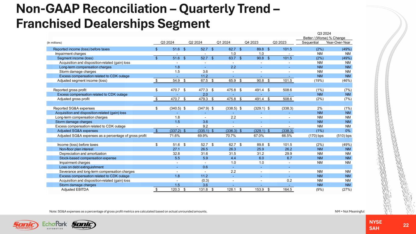 NYSE SAH GAAP Income Statement – Quarterly Trend – Franchised Dealerships Segment 21 NM = Not MeaningfulNote: Gross profit per unit metrics are calculated based on actual unrounded amounts. Q3 2024 Better / (Worse) % Change (In millions, except unit and per unit data) Q3 2024 Q2 2024 Q1 2024 Q4 2023 Q3 2023 Sequential Year-Over-Year Revenues: Retail new vehicles 1,539.9$ 1,530.9$ 1,439.9$ 1,664.1$ 1,546.7$ 1% 0% Fleet new vehicles 22.2 26.2 19.6 21.8 23.2 (15%) (4%) Total new vehicles 1,562.1 1,557.1 1,459.5 1,685.9 1,569.9 0% 0% Used vehicles 701.4 732.1 729.3 727.5 780.7 (4%) (10%) Wholesale vehicles 42.4 48.4 48.6 39.3 51.4 (12%) (18%) Total vehicles 2,305.9 2,337.6 2,237.4 2,452.7 2,402.0 (1%) (4%) Parts, service and collision repair 458.9 434.4 439.9 425.2 431.8 6% 6% Finance, insurance and other, net ("F&I") 122.4 124.2 119.6 123.2 126.0 (1%) (3%) Total revenues 2,887.2 2,896.2 2,796.9 3,001.1 2,959.8 0% (2%) Gross profit: Retail new vehicles 83.5 94.9 94.1 122.2 125.5 (12%) (33%) Fleet new vehicles 0.6 1.0 0.7 0.9 0.9 (38%) (33%) Total new vehicles 84.1 95.9 94.8 123.1 126.4 (12%) (33%) Used vehicles 34.6 38.7 40.8 35.1 42.6 (11%) (19%) Wholesale vehicles (1.1) (0.5) (0.2) (2.7) (1.5) (145%) 27% Total vehicles 117.6 134.1 135.4 155.5 167.5 (12%) (30%) Parts, service and collision repair 230.7 219.0 220.8 212.6 215.1 5% 7% Finance, insurance and other, net 122.4 124.2 119.6 123.2 126.0 (1%) (3%) Total gross profit 470.7 477.3 475.8 491.3 508.6 (1%) (7%) SG&A expenses (340.5) (347.9) (338.5) (329.1) (338.3) 2% (1%) Impairment charges - - (1.0) (1.0) - NM NM Depreciation and amortization (31.5) (30.4) (29.8) (29.4) (28.2) (4%) (12%) Operating income (loss) 98.7 99.0 106.5 131.8 142.1 0% (31%) Interest expense, floor plan (18.7) (18.0) (16.0) (14.6) (12.9) (4%) (45%) Interest expense, other, net (28.5) (27.8) (27.8) (27.5) (27.9) (3%) (3%) Other income (expense), net 0.1 (0.5) - 0.1 0.2 NM NM Income (loss) before taxes 51.6$ 52.7$ 62.7$ 89.8$ 101.5$ (2%) (49%) Unit sales volume: Retail new vehicles 27,391 26,512 25,297 28,491 26,869 3% 2% Fleet new vehicles 406 514 379 500 469 (21%) (13%) Used vehicles 24,940 25,668 25,666 24,365 25,541 (3%) (2%) Wholesale vehicles 4,973 5,248 5,105 4,440 5,163 (5%) (4%) Gross profit per unit ("GPU"): Retail new vehicles 3,047$ 3,579$ 3,722$ 4,289$ 4,672$ (15%) (35%) Used vehicles 1,386$ 1,508$ 1,592$ 1,440$ 1,666$ (8%) (17%) F&I 2,340$ 2,380$ 2,348$ 2,330$ 2,403$ (2%) (3%)