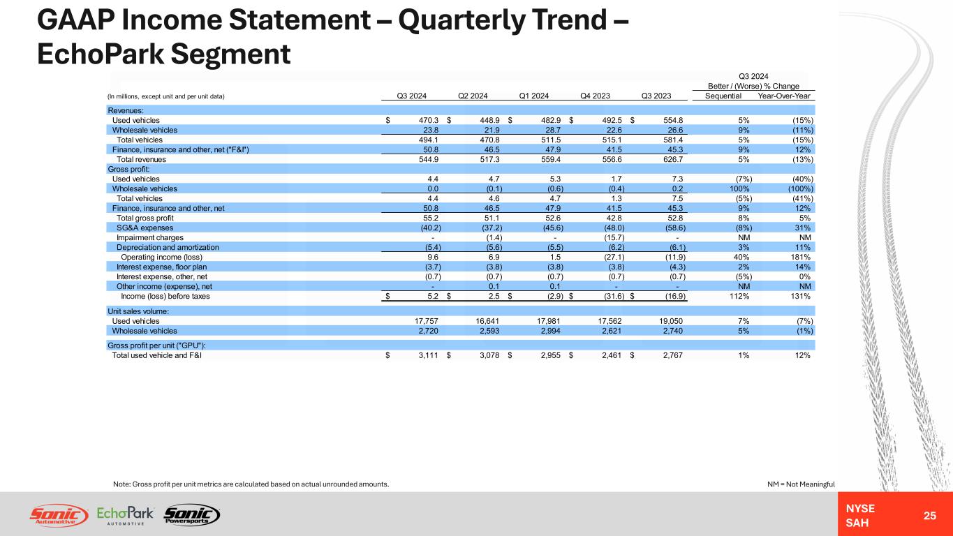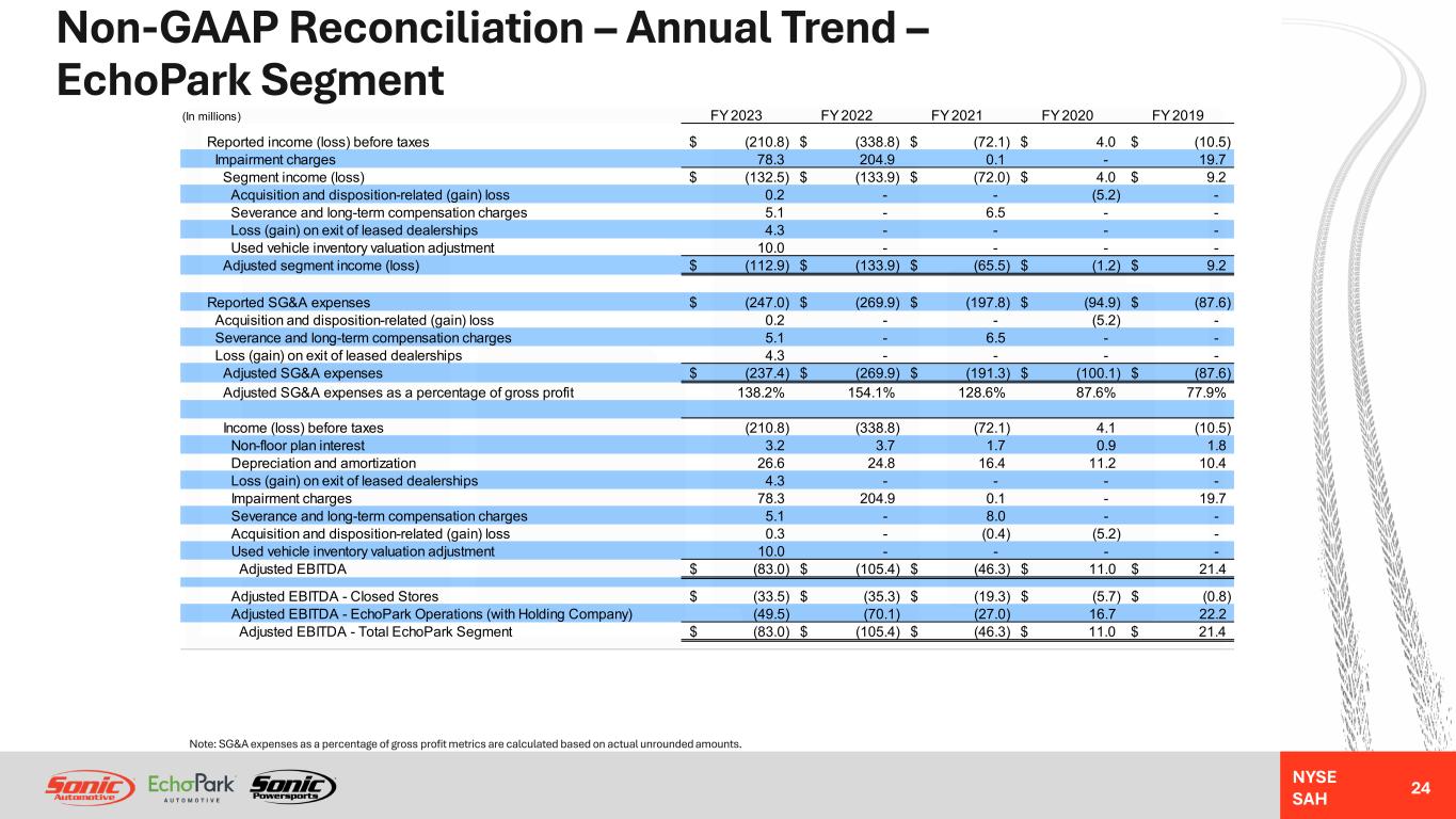 NYSE SAH GAAP Income Statement – Annual Trend – EchoPark Segment 23 NM = Not MeaningfulNote: Gross profit per unit metrics are calculated based on actual unrounded amounts. FY 2023 Better / (Worse) % Change (In millions, except unit, per unit, and per share data) FY 2023 FY 2022 FY 2021 FY 2020 FY 2019 Year-Over-Year Revenues: Total new vehicles 1.0$ 9.2$ 9.0$ -$ -$ (89%) Used vehicles 2,143.8 2,116.8 2,032.6 1,258.2 1,025.3 1% Wholesale vehicles 111.7 170.6 110.0 28.7 22.9 (35%) Total vehicles 2,256.5 2,296.6 2,151.6 1,286.9 1,048.2 (2%) Finance, insurance and other, net ("F&I") 177.9 166.4 193.7 132.1 113.8 7% Total revenues 2,434.4 2,463.0 2,345.3 1,419.0 1,162.0 (1%) Gross profit: Total new vehicles 0.1 1.1 1.1 - - (93%) Used vehicles (17.1) 4.4 (55.2) (18.0) (1.0) (490%) Wholesale vehicles 0.9 3.2 9.2 (0.1) (0.4) (74%) Total vehicles (16.1) 8.7 (44.9) (18.1) (1.4) (286%) Finance, insurance and other, net 177.9 166.4 193.7 132.1 113.8 7% Total gross profit 161.8 175.1 148.8 114.0 112.4 (8%) SG&A expenses (247.0) (269.9) (197.8) (94.9) (87.6) 8% Impairment charges (78.3) (204.9) (0.1) - (19.7) NM Depreciation and amortization (26.6) (24.6) (16.3) (11.0) (10.5) (8%) Operating income (loss) (190.1) (324.3) (65.4) 8.1 (5.4) 41% Interest expense, floor plan (17.4) (10.6) (5.0) (3.2) (3.5) (64%) Interest expense, other, net (3.2) (3.9) (1.7) (0.9) (1.7) 17% Other income (expense), net (0.1) - - - 0.1 NM Income (loss) from continuing operations before taxes (210.8)$ (338.8)$ (72.1)$ 4.0$ (10.5)$ 38% Unit sales volume: Retail new vehicles 11 152 128 - - (93%) Used vehicles 73,676 64,107 77,835 57,161 49,520 15% Wholesale vehicles 11,512 11,236 11,667 7,178 5,774 2% Gross profit per unit ("GPU"): Retail new vehicles 6,934$ 7,510$ 8,303$ N/A N/A (8%) Total used vehicle and F&I 2,183$ 2,657$ 1,762$ 2,013$ 2,296$ (18%)